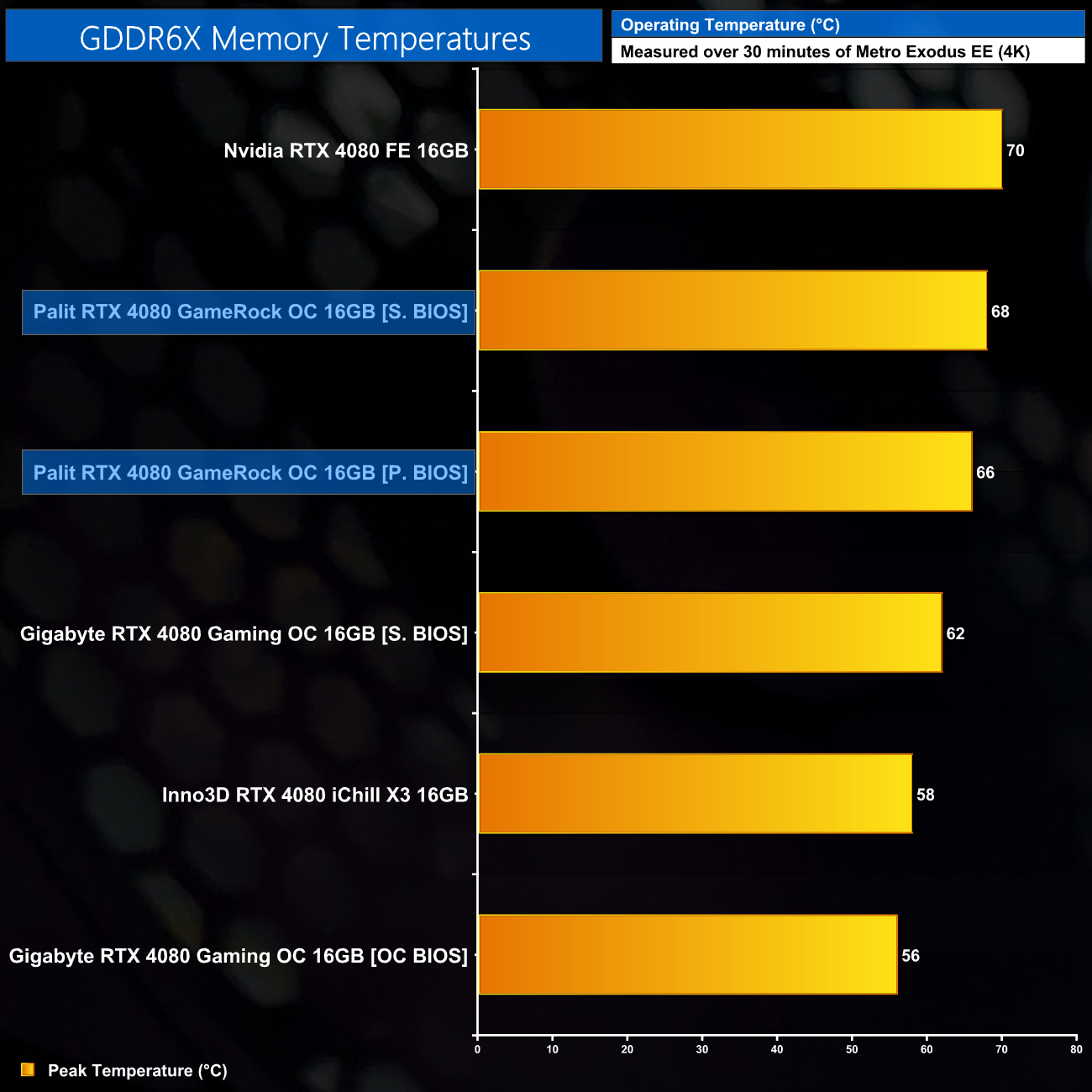 Memory thermals aren't quite so competitive, with the Performance BIOS at 66C and the Silent BIOS at 68C. Those are still very good results, but are only small improvements over the Founders Edition – but once again, it's hard to argue when the temperatures are this low to begin with.