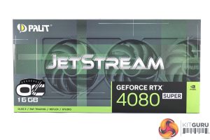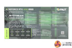 Palit's RTX 4080 Super JetStream OC ships in a greenish and grey box, with a desaturated image of the graphics card visible underneath the large JetStream logo. On the back, key features of the card are highlighted in multi-lingual text.