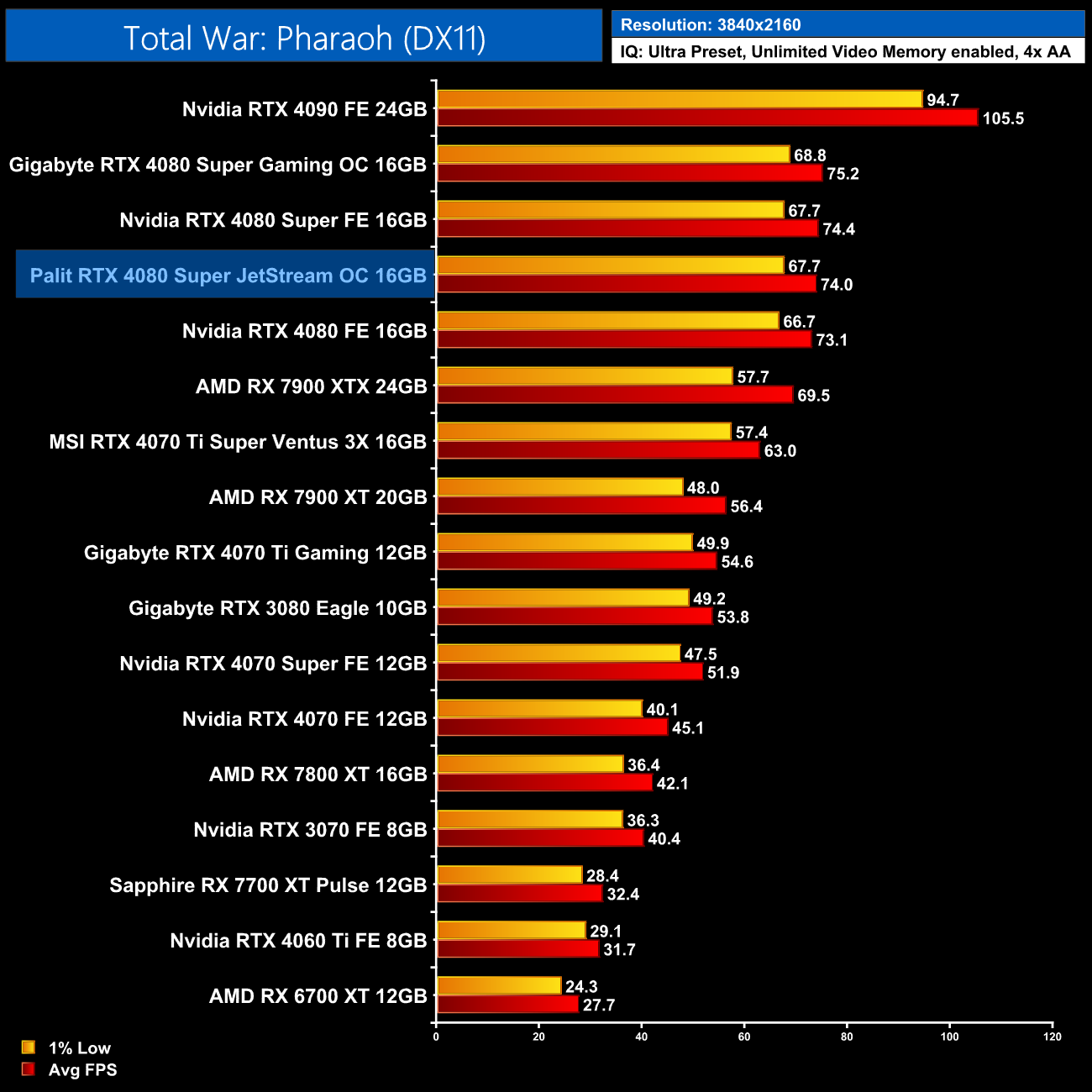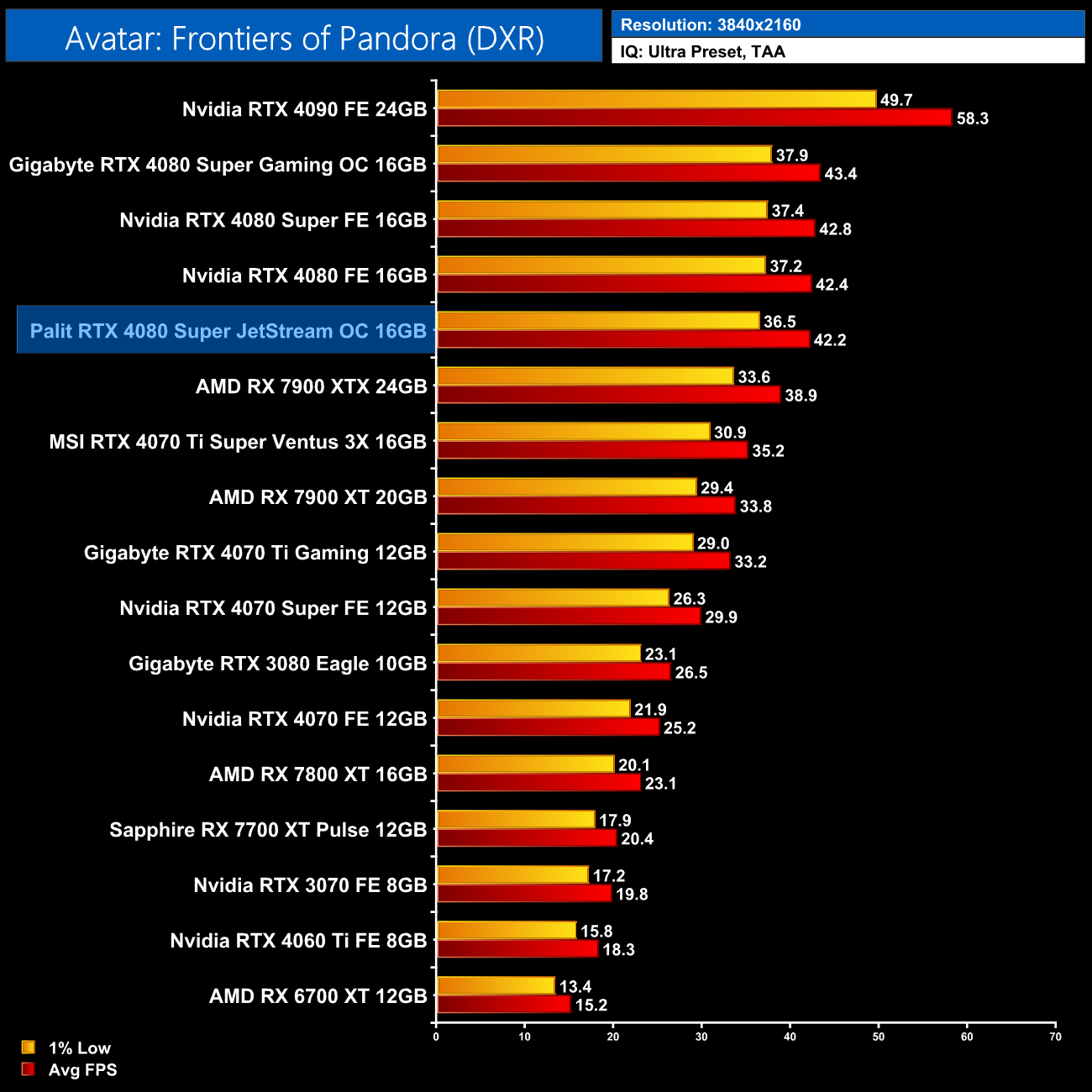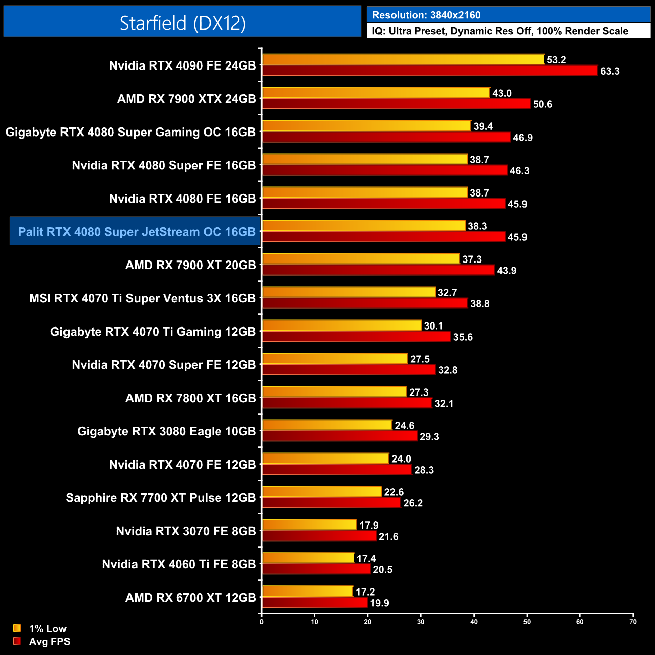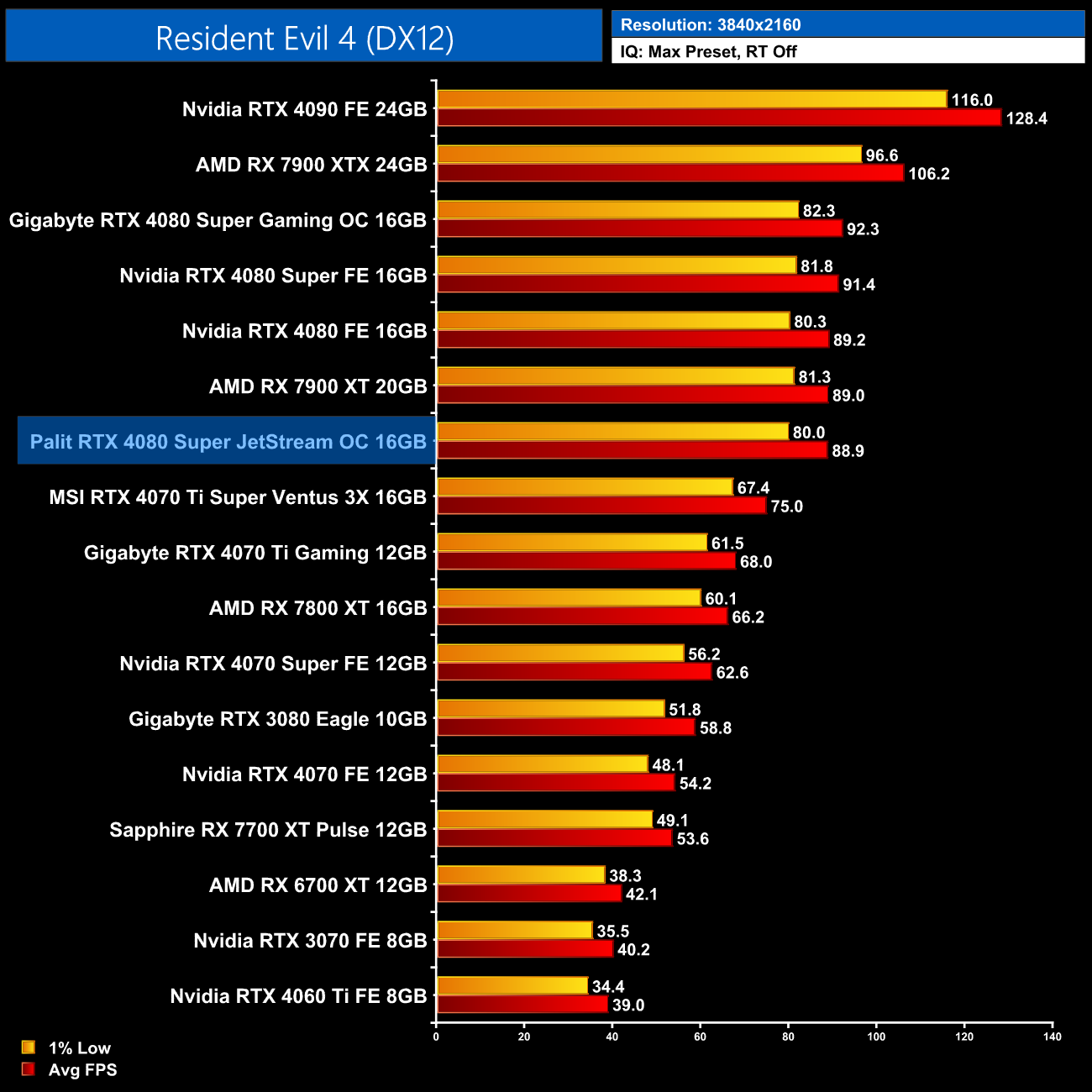 Our game testing throws up one curiosity – the JetStream OC 4080 Super actually ran marginally slower than our RTX 4080 (non-Super) Founders Edition. I do discuss this in our review of the 4080 Super FE, but it does appear that our vanilla 4080 FE is a particularly ‘good' sample, boosting to higher speeds than the 4080 Super, despite having a lower rated clock speed. As we will see on the next page, the JetStream OC also doesn't boost particularly high – leaving us in a weird situation where a higher-performing 4080 is actually faster than a slightly below-par 4080 Super! Of course, the differences are very, very small, but it is still a bit strange.