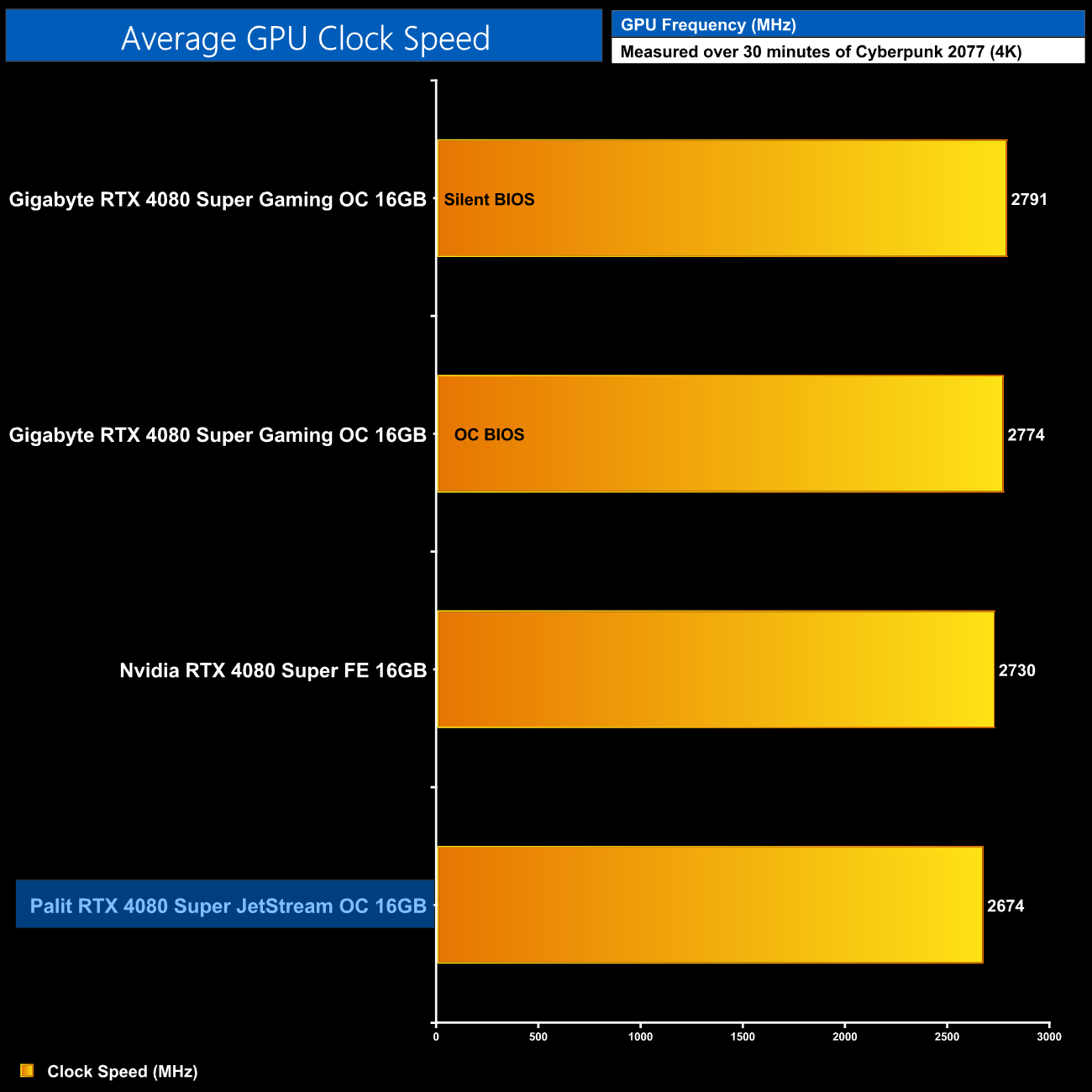 Looking at the JetStream OC's clock speeds, we saw it typically about 60MHz slower than the Founders Edition in our 30-minute stress test using Cyberpunk 2077, but in some games this difference was more like 100-120MHz. It is still above its rated boost clock, so it's not like it is thermally throttling or performing below spec – it's just not boosting as far as the Founders Edition, or the Gigabyte Gaming OC for that matter.