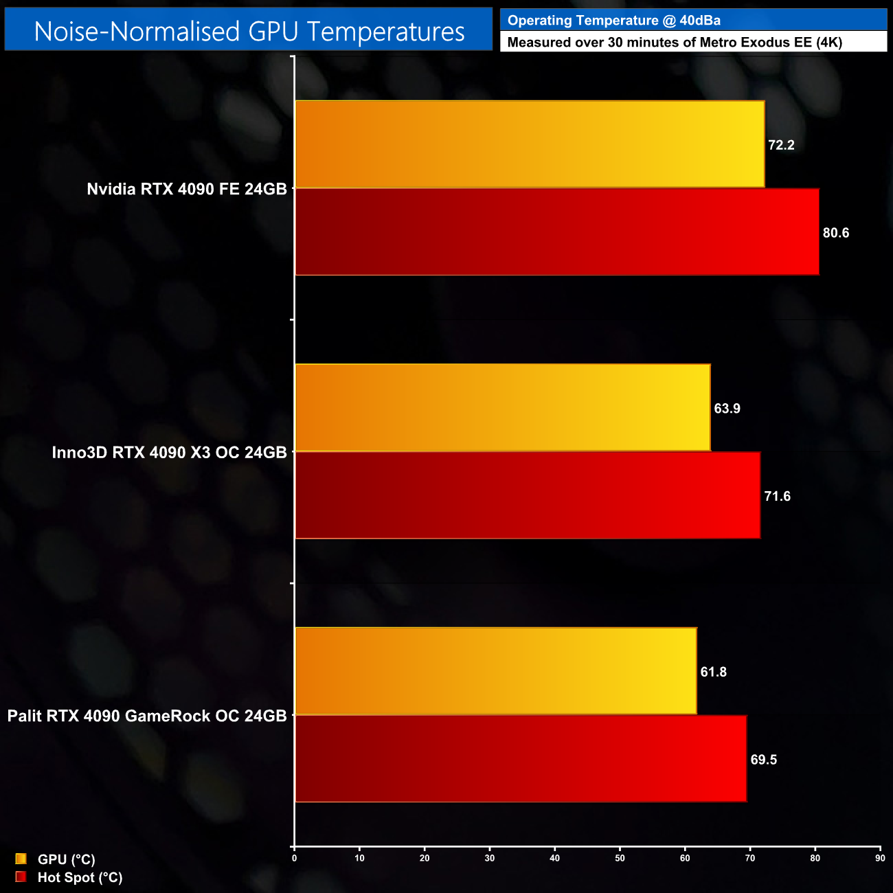 To hit 40dBa noise output, we increased fan speed up to 1780rpm, or 48%. That resulted in the best RTX 4090 thermal performance yet, with the GPU at 61.8c and the Hot Spot at 69.5C, making it about 2c cooler than the Inno3D X3 OC. Memory thermals, meanwhile, hit 68C, so that's another 2 degree reduction against the Inno3D.