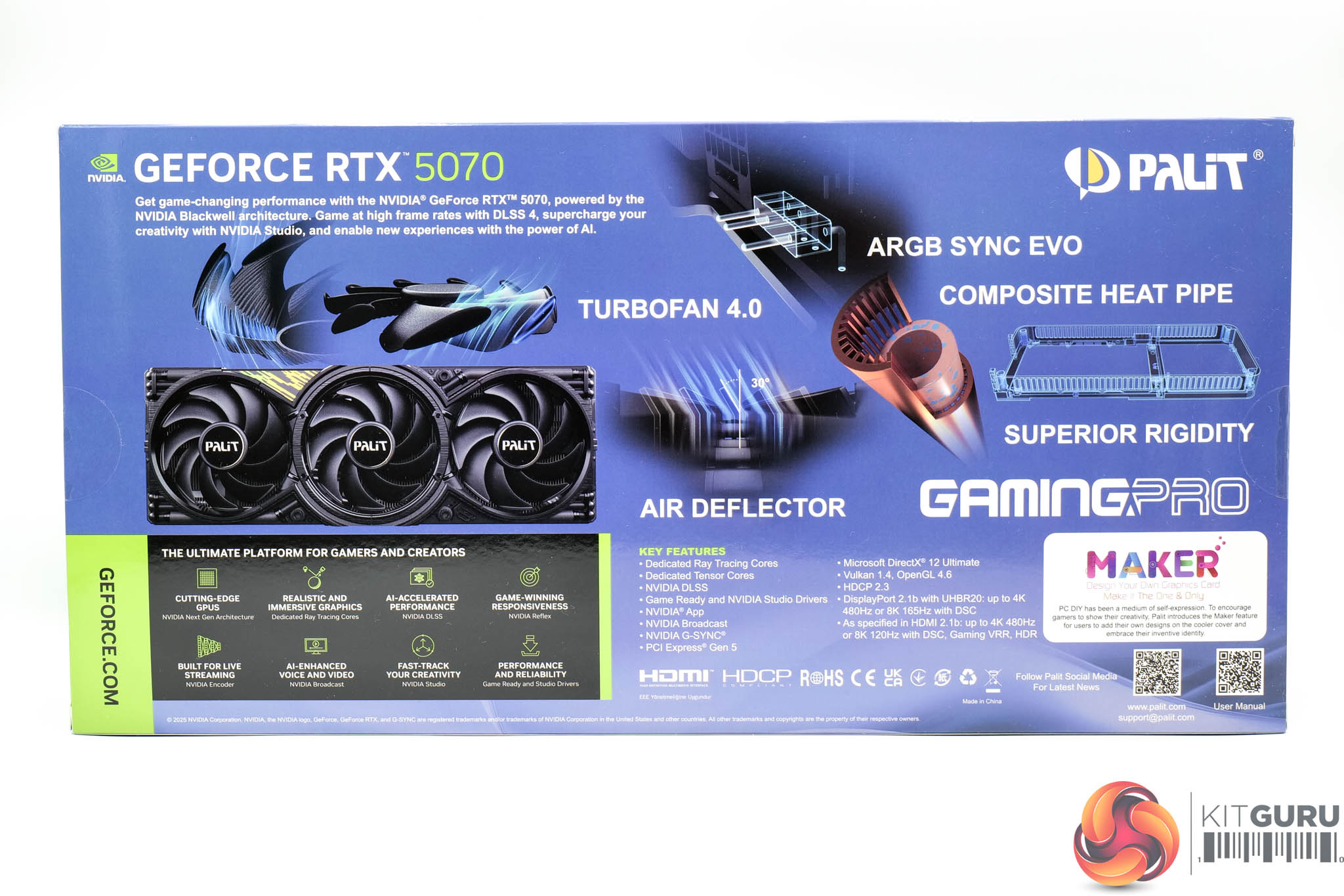 The Palit RTX 5070 GamingPro OC ships in a blue box with a large image of the graphics card visible on the front. On the back, Palit mentions a few key areas of the graphics card.