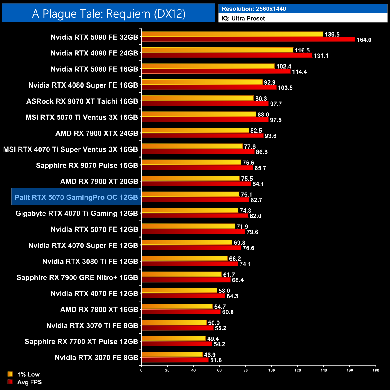 We don't focus too heavily on game benchmarks in our partner cards reviews as performance doesn't tend to change a whole lot when compared to the reference models. That was certainly the case for the GamingPro OC, given we saw just no more than a 5fps difference compared to the reference clocked RTX 5070 FE over the three games we tested.