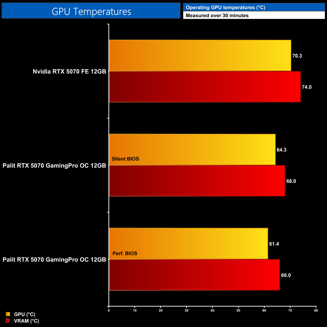 As for out of the box thermal performance, the GamingPro OC is a clear improvement over the Nvidia FE. The Silent BIOS saw 6C reductions to both GPU and VRAM temperatures, while the Performance BIOS runs cooler still, hitting just 61C on the GPU and 66C on the VRAM.