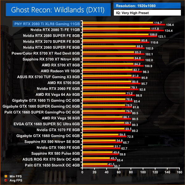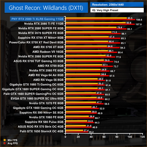 Despite being an older title, Wildlands is still a stern test for modern GPUs and we see that with results very similar to Gears 5 – over 100FPS on average at 1440p, with 4K gameplay offering 68FPS average, with minimums of 53FPS.