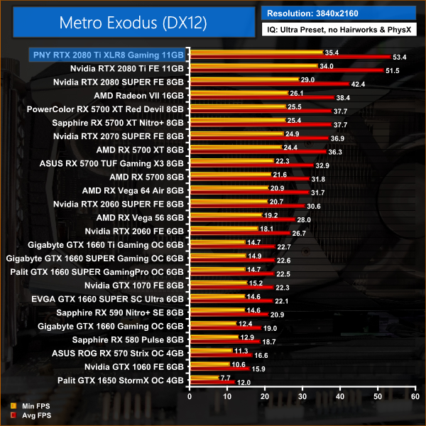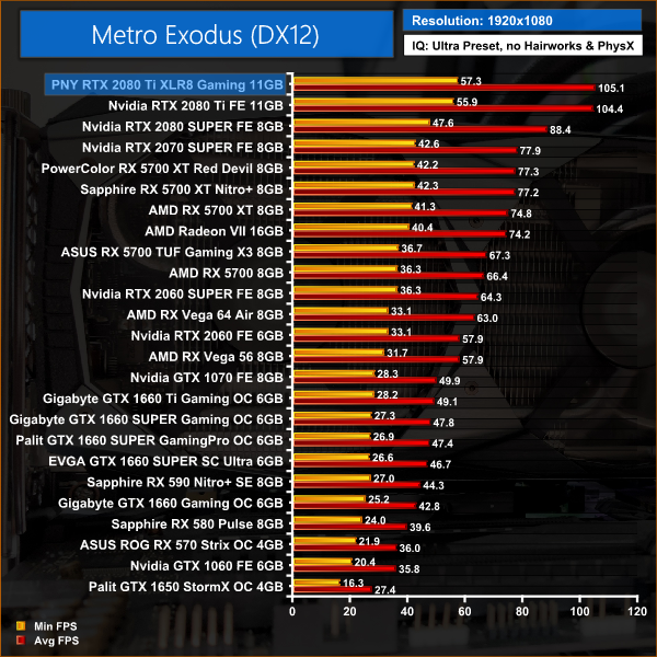 Metro Exodus is a punishing title to run with Ultra settings, particularly when using the game's built-in benchmark. Here, though, the XLR8 comes out on top at every resolution tested, offering 4% increased performance at 4K versus the Founders Edition.