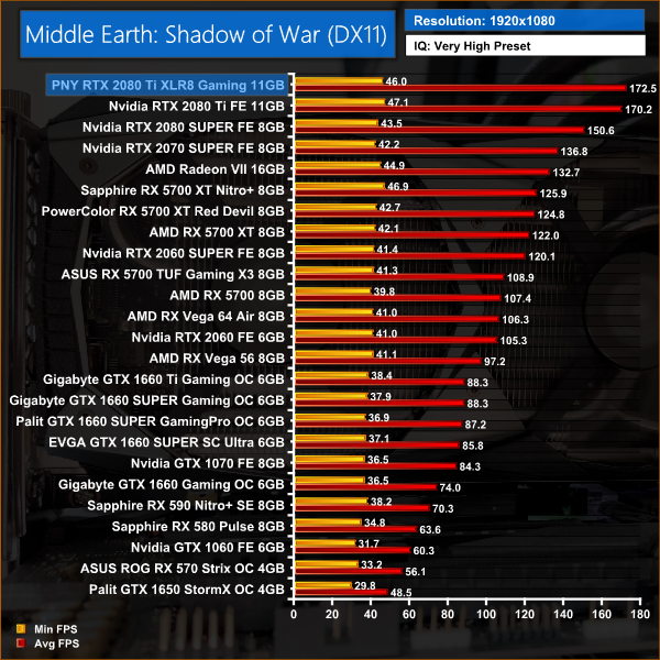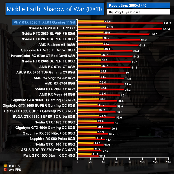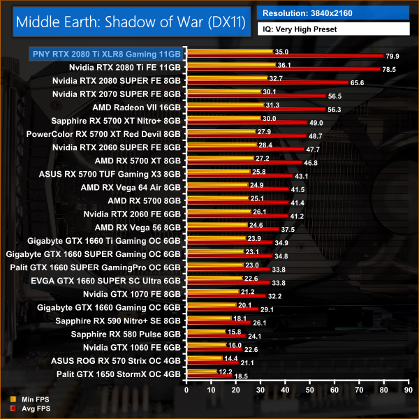 Shadow of War is starting to show its age, with the XLR8 2080 Ti able to push almost 140FPS when playing at 1440p. At 4K, average frame rate is just below 80FPS.