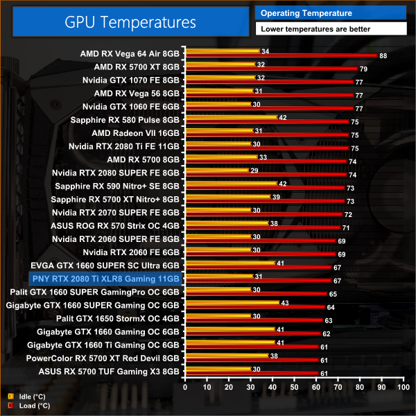 For our temperature testing, we measure the peak GPU core temperature under load, as well as the GPU temperature with the card idling on the desktop. A reading under load comes from running the 3DMark Fire Strike Ultra stress test for 30 minutes. An idle reading comes after leaving the system on the Windows desktop for 30 minutes.