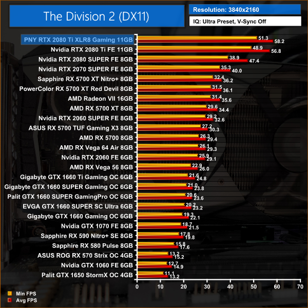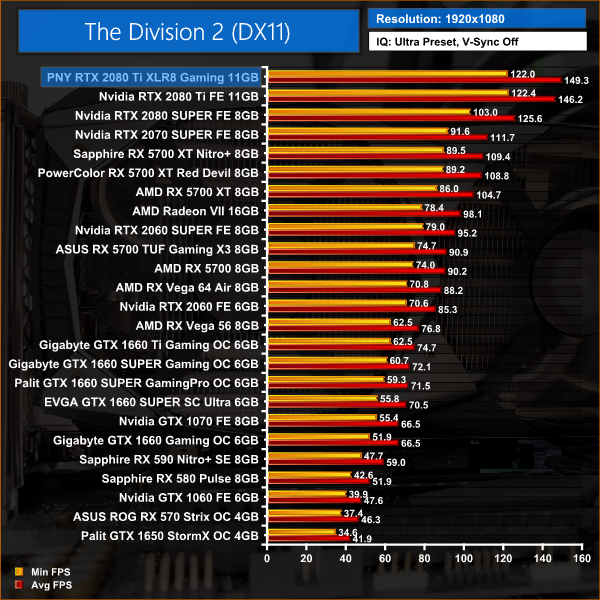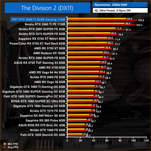 While the 2080 Ti can't quite push 60FPS at 4K/Ultra with The Division 2, it's still a remarkably smooth experience at that resolution. Averaging over 100FPS at 1440p, too, shows that this is a great high-refresh rate 1440p card.
