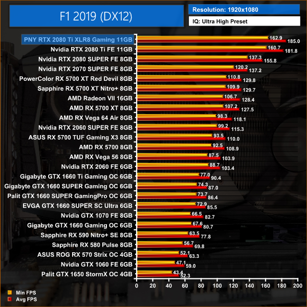F1 2019 is a less demanding title than some others we test, and accordingly the XLR8 reaches almost 200FPS average at 1080p, even using Ultra High settings. 4K gamers would even get good mileage out of a pricy 4K/144Hz monitor, with this card averaging 91FPS at 2160p.