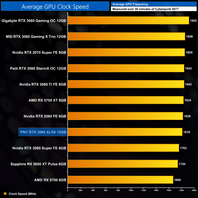 Looking at the average operating clock frequency of the XLR8, it becomes clear why we did see this card running a touch slower than the other RTX 3060s during our game benchmarks. It averaged 1816MHz, roughly 25MHz slower than the Palit StormX, but over 100MHz slower than the Gigabyte Gaming OC, which is the fastest RTX 3060 we have tested to-date. The differences aren't massive, and they are to be expected considering the XLR8 isn't factory overclocked, but it does explain why we saw the gaming performance results that we did.
