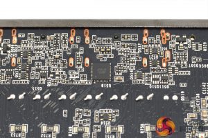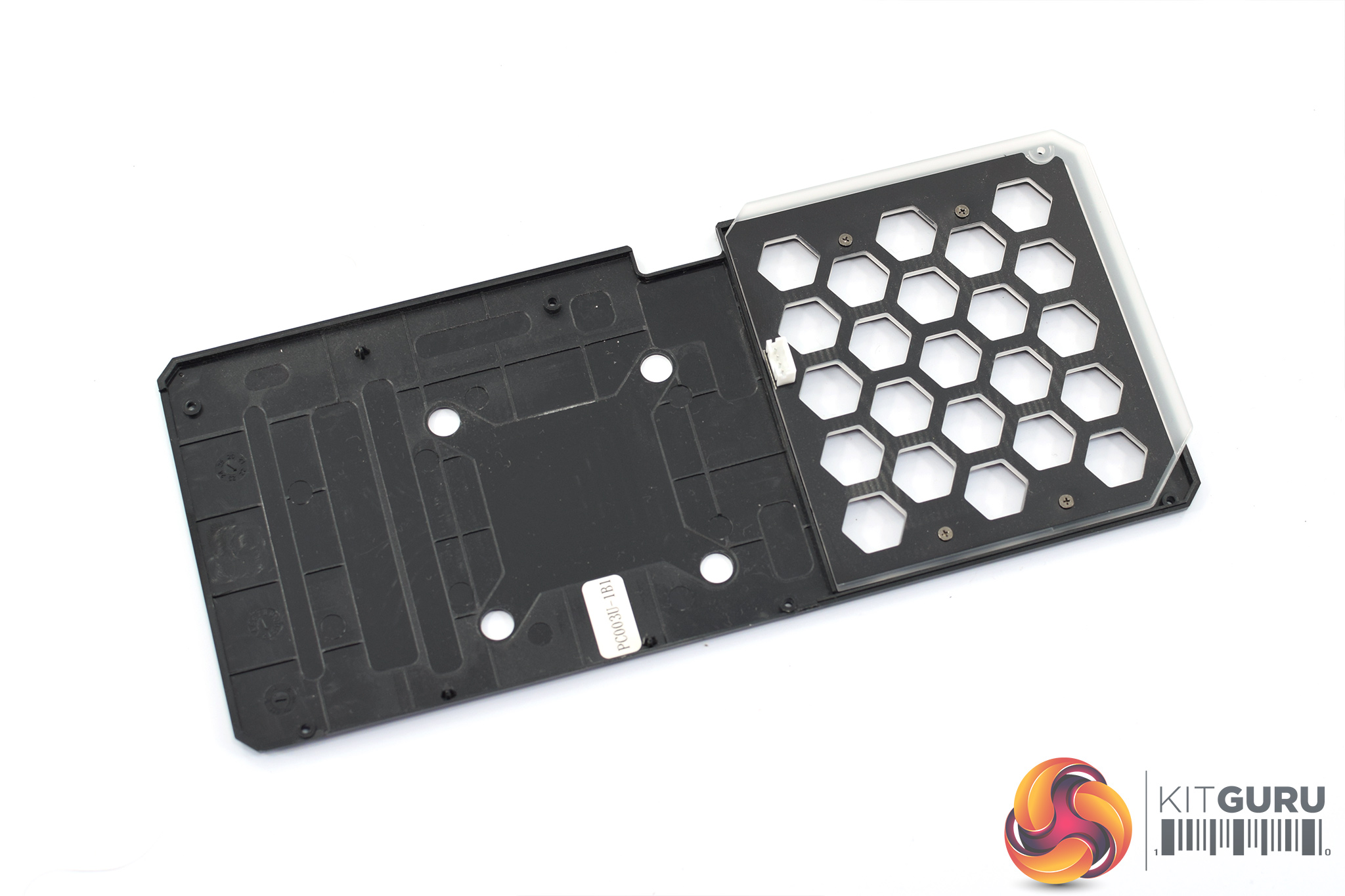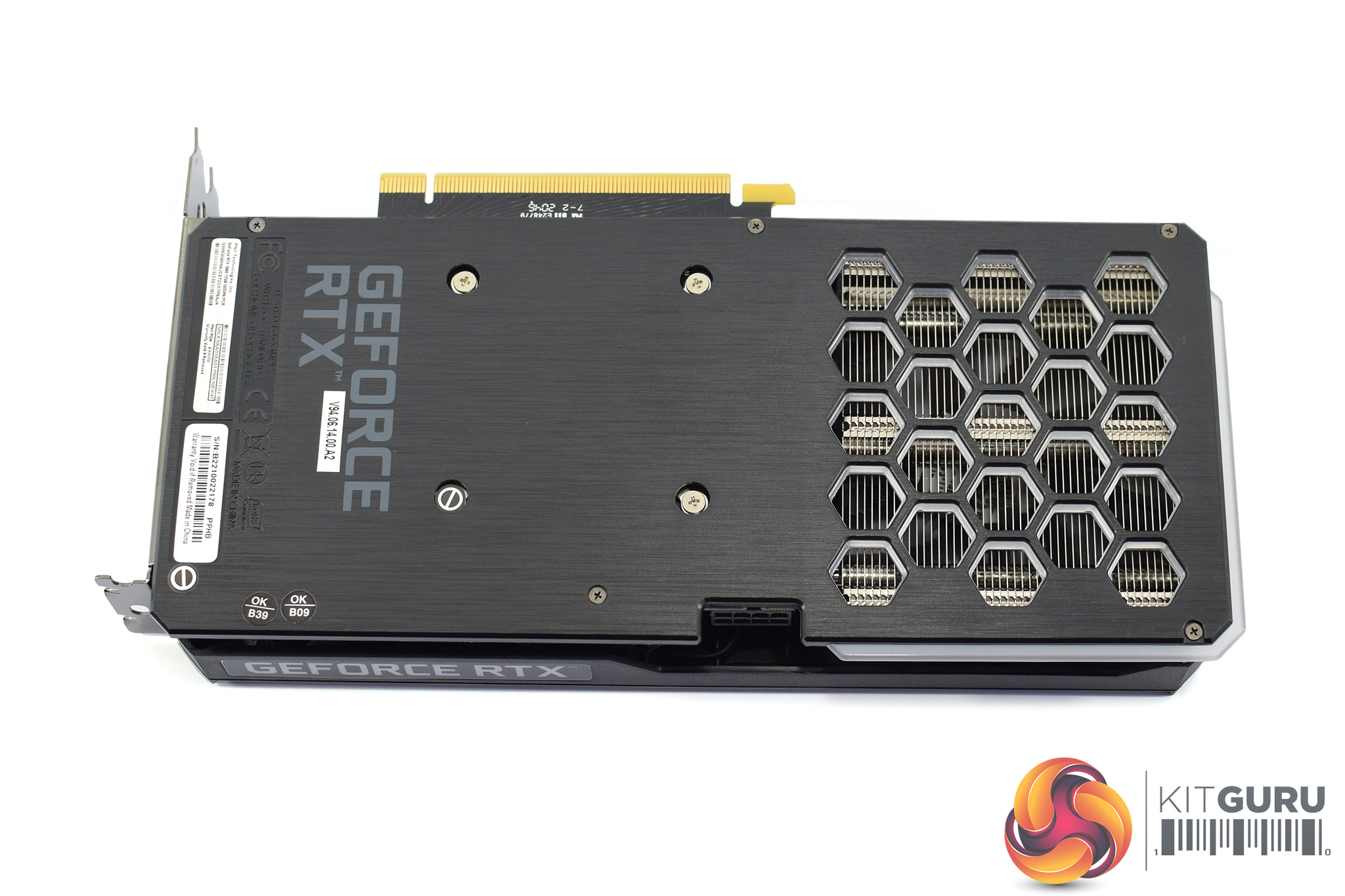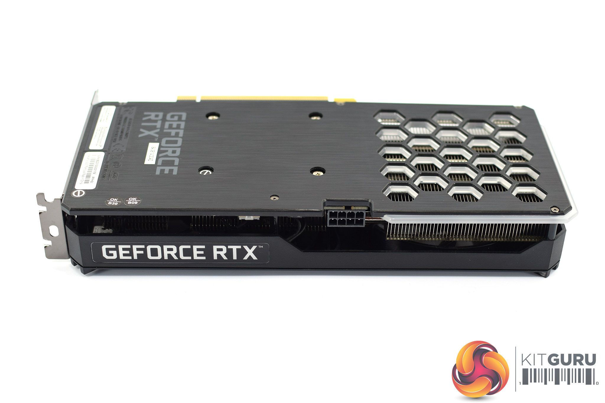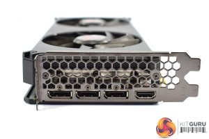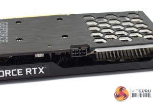 Looking now at the back of the card, we can see a plastic backplate, again sporting the same brushed effect design as on the front of the shroud. We can also note several hexagonal cut-outs to allow direct airflow through the heatsink.