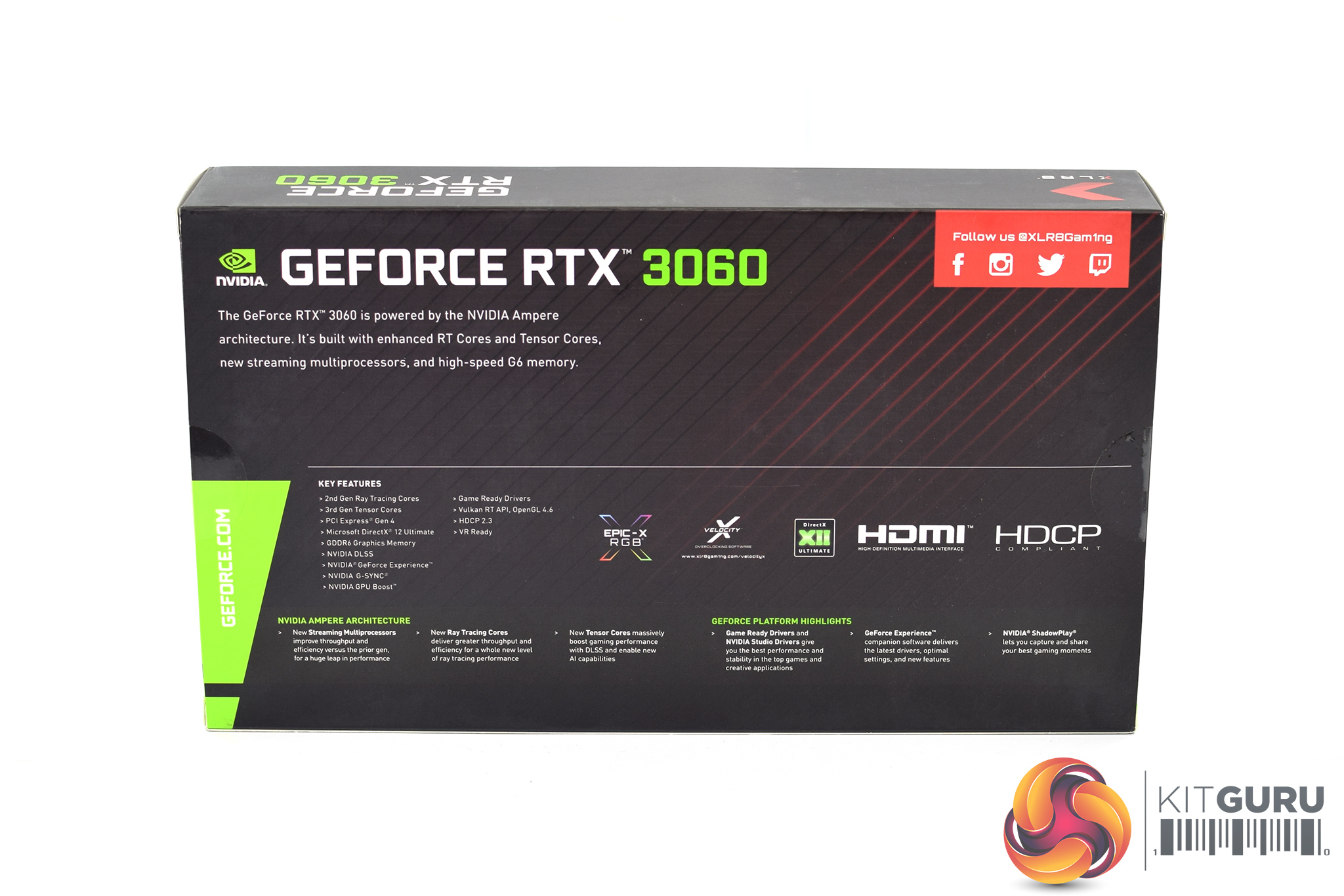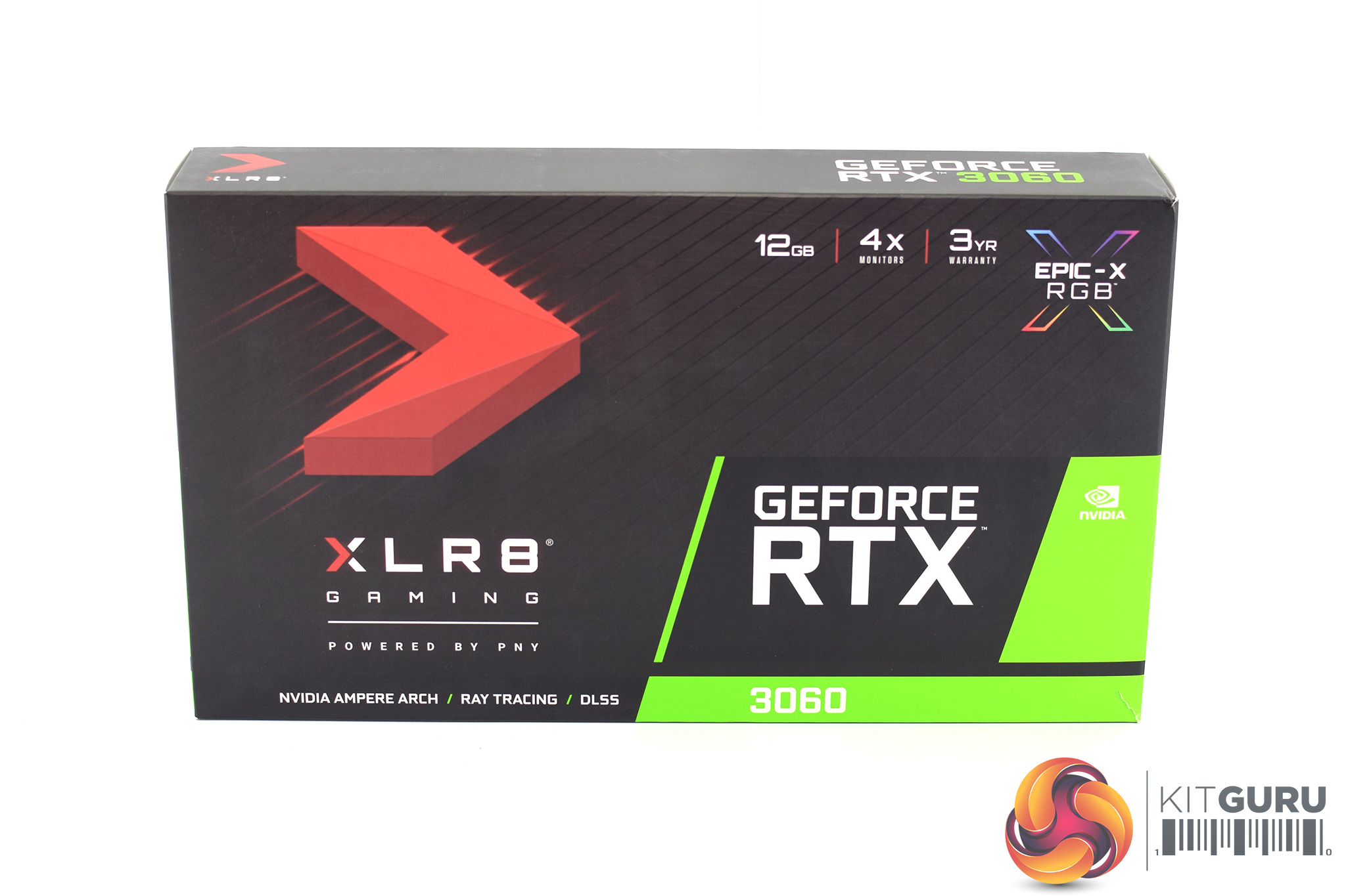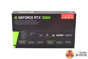 The PNY RTX 3060 XLR8 Gaming ships in a black box, with the XLR8 logo on the front. On the back, PNY highlights the key specifications of the GPU.