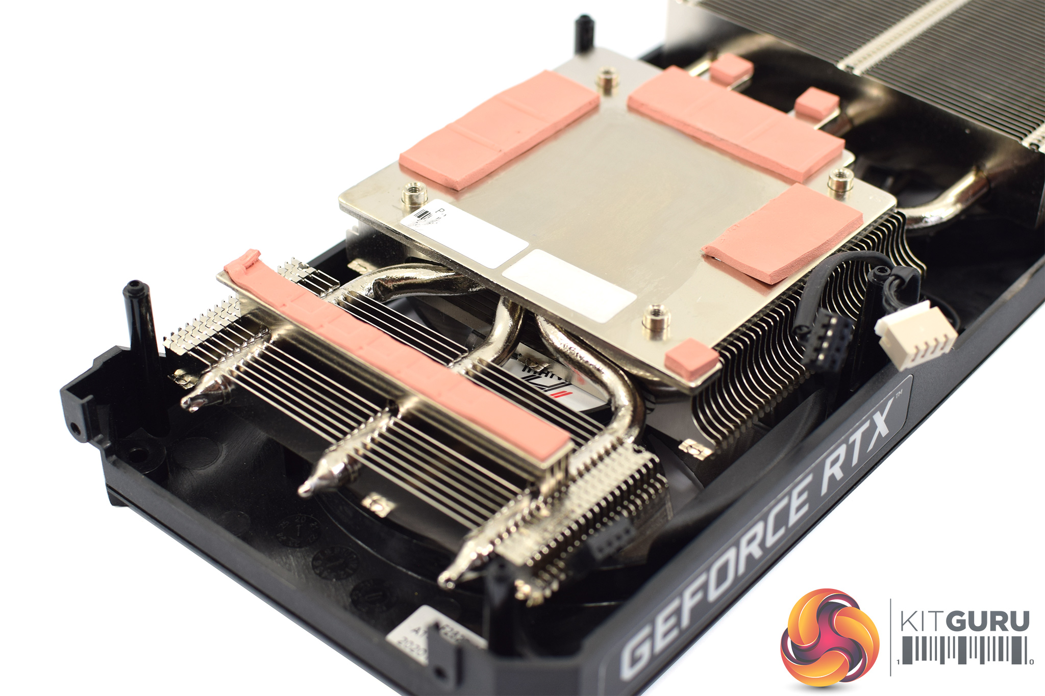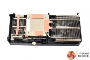 As for the cooler, this is comprised of three separate aluminium fin stacks, connected by three 6mm heatpipes. A large baseplate is used to contact both the GPU and the memory, while one smaller plate is used to cool the GPU VRM, via some pink thermal pads.
