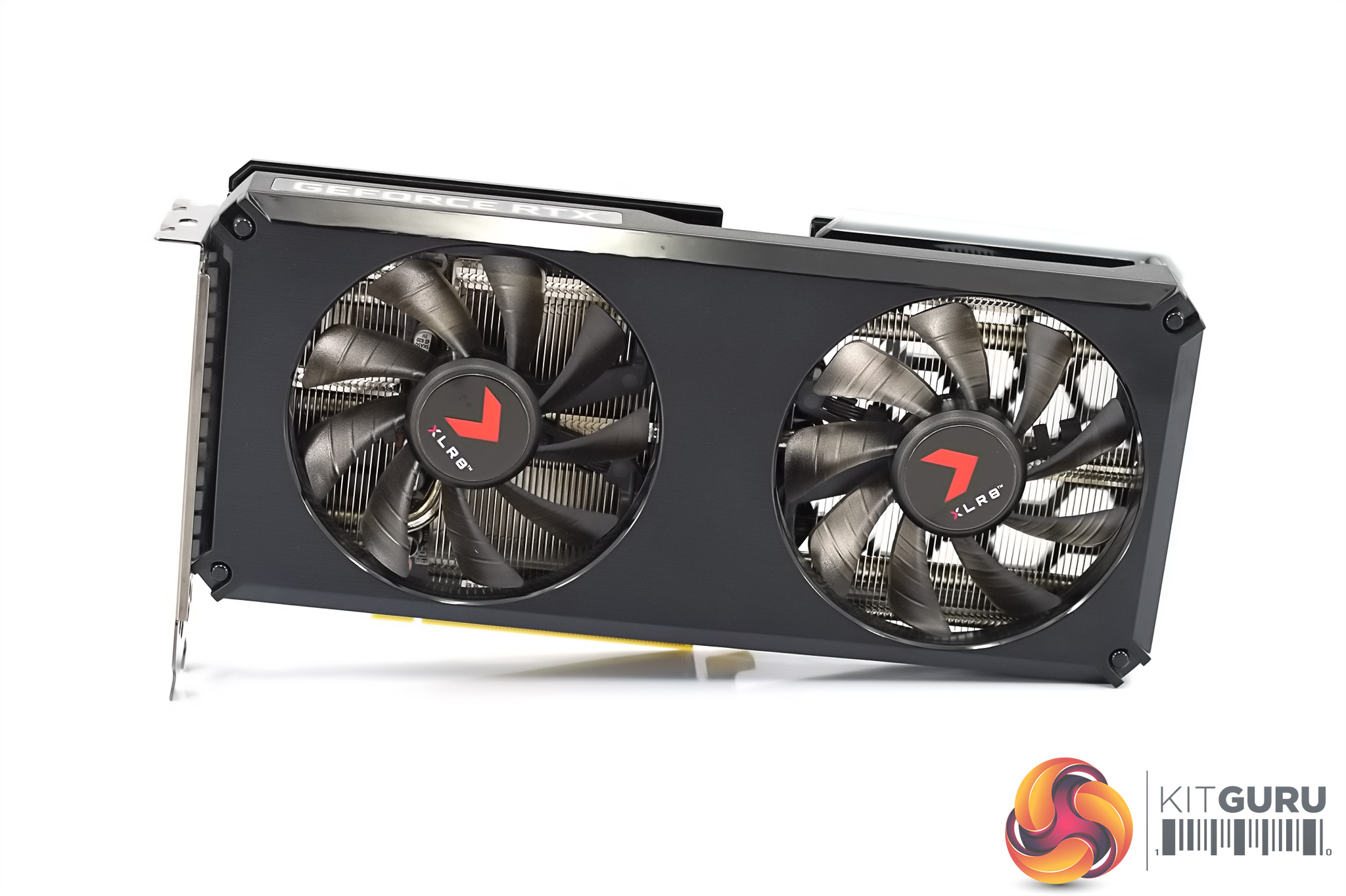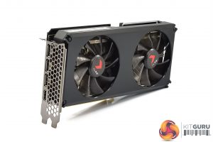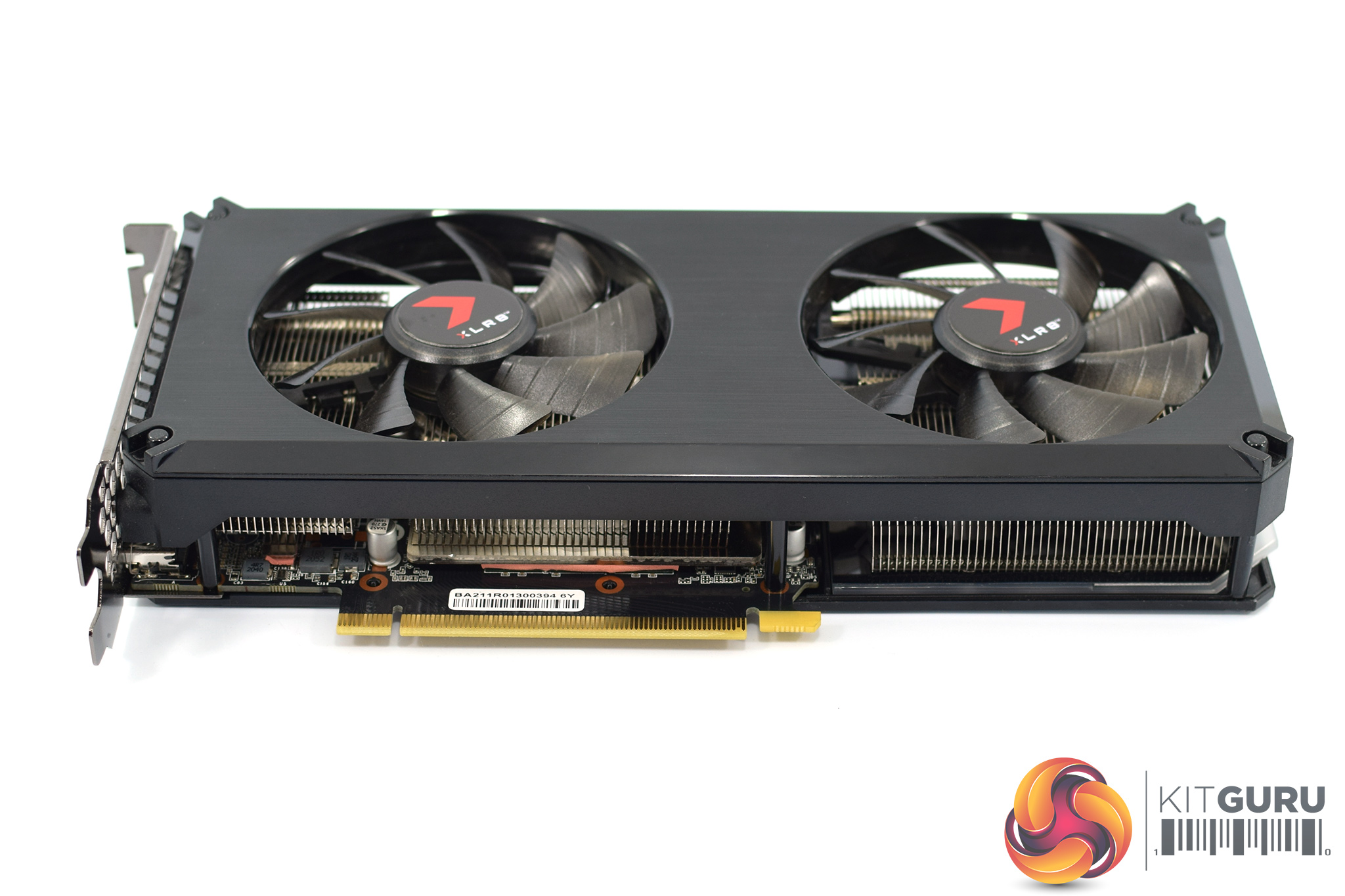 As for the design of the card, it's a pretty understated overall appearance. The shroud is made of matte black plastic, sporting a brushed effect design. The two fans measure 90mm across, with just a hint of colour coming from the red XLR8 sticker on the fan hubs. There's not a whole lot to say other than that – some might like this, as it's not a flashy or eye-grabbing card, but you could also argue it is a bit on the plain side.