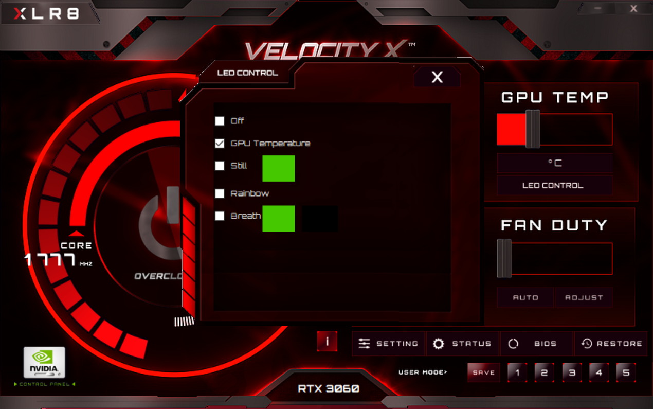 The XLR8's RGB lighting is controlled with PNY's Velocity X software. Visually it is very clunky with low-resolution text, and the number of RGB modes are limited. There's the option to have the lighting react to GPU temperature, set a static colour, and then rainbow and breathing modes.