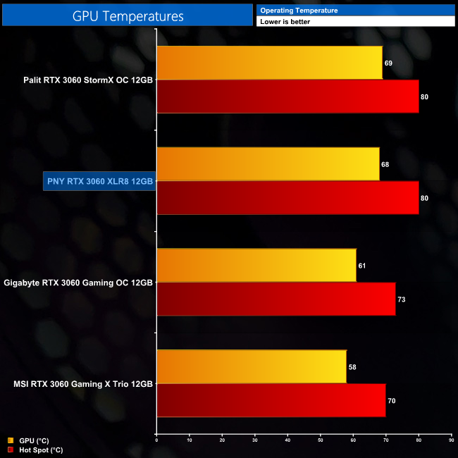 In terms of temperatures, the XLR8 is a decent cooler. It kept the GPU temperature to just 68C, while the hot spot peaked at just 80C. It's not much better than the Palit StormX OC, but it's certainly good enough to not be a problem for the card.