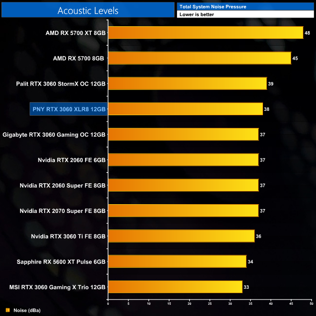 We take our noise measurements with the sound meter positioned 1 foot from the graphics card. I measured the noise floor to be 32 dBA, thus anything above this level can be attributed to the graphics cards. The power supply is passive for the entire power output range we tested all graphics cards in, while all CPU and system fans were disabled. A reading under load comes from running Cyberpunk 2077 for 30 minutes.