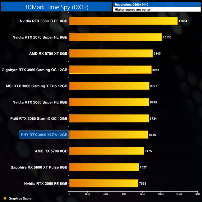 Kicking off with our 3DMark benchmarks, overall scores for the PNY RTX 3060 XLR8 are a touch below the other RTX 3060s we have reviewed, though not by much – it's just 1% slower than the Palit StormX OC in the Time Spy benchmark.