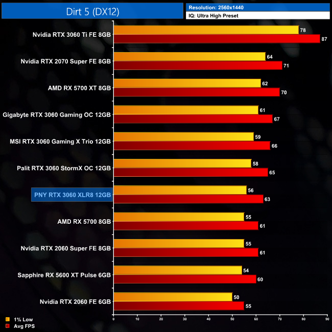 As for Dirt 5, here we can see the XLR8 again slightly behind the other RTX 3060s. At 1080p it's just a single frame off the pace, but at 1440p it fell 2FPS behind the StormX OC and 4FPS behind the Gaming OC.
