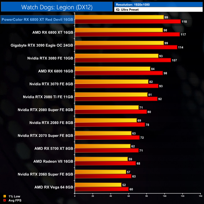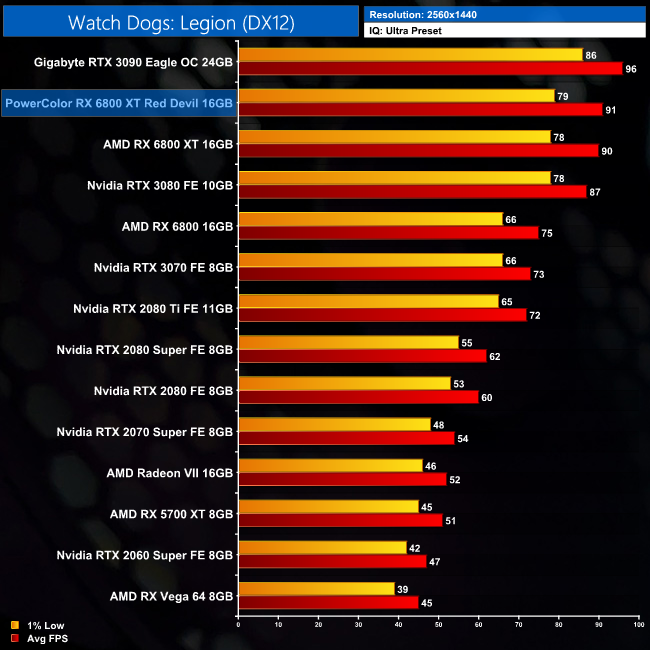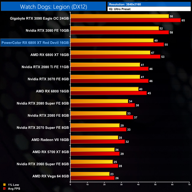 Last but not least we have Watch Dogs: Legion. In this title, the Red Devil averages 55FPS at 4K, which works out as a 4% lead over the reference card. Compared to the RTX 3080 Founders Edition, it is 5% slower.