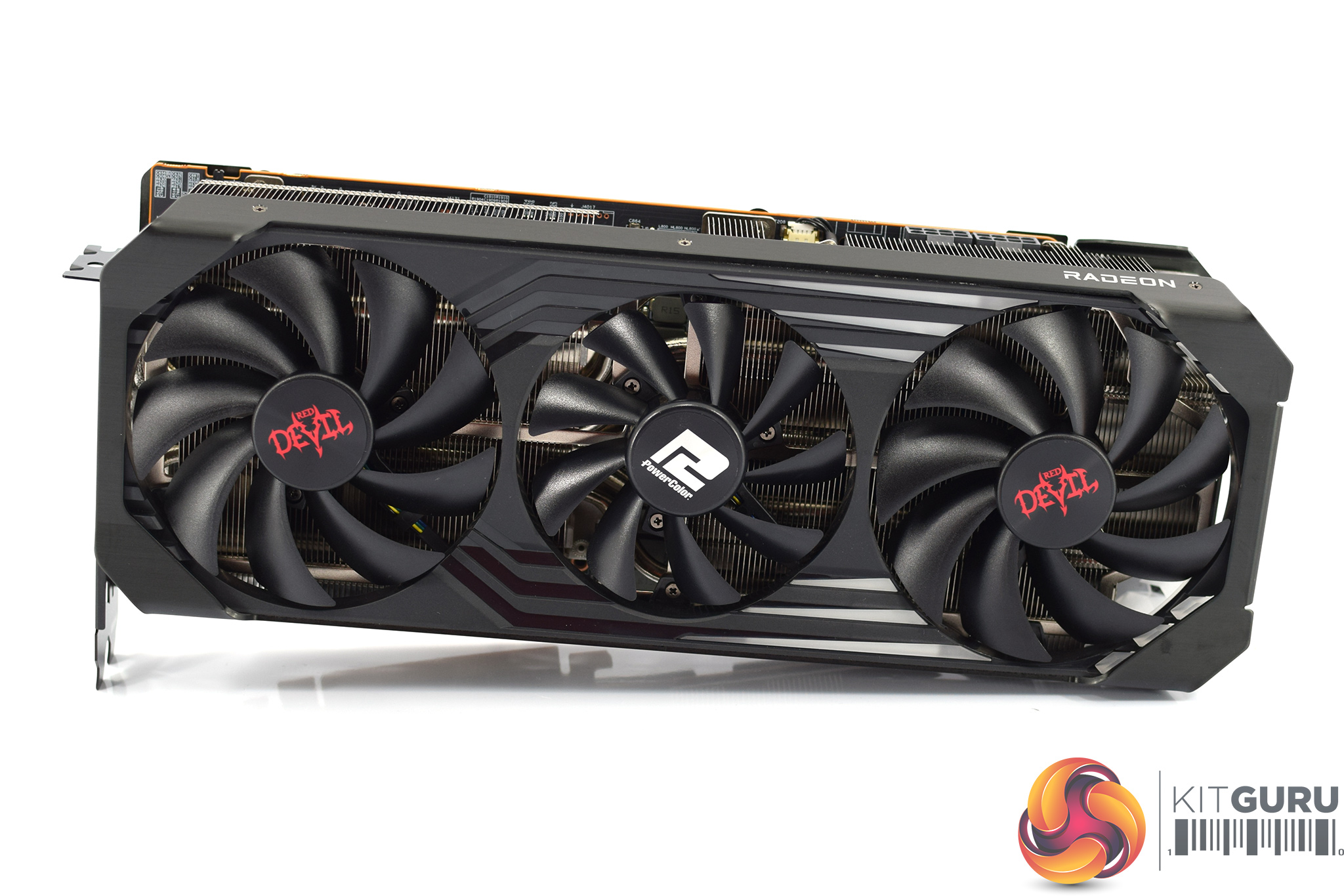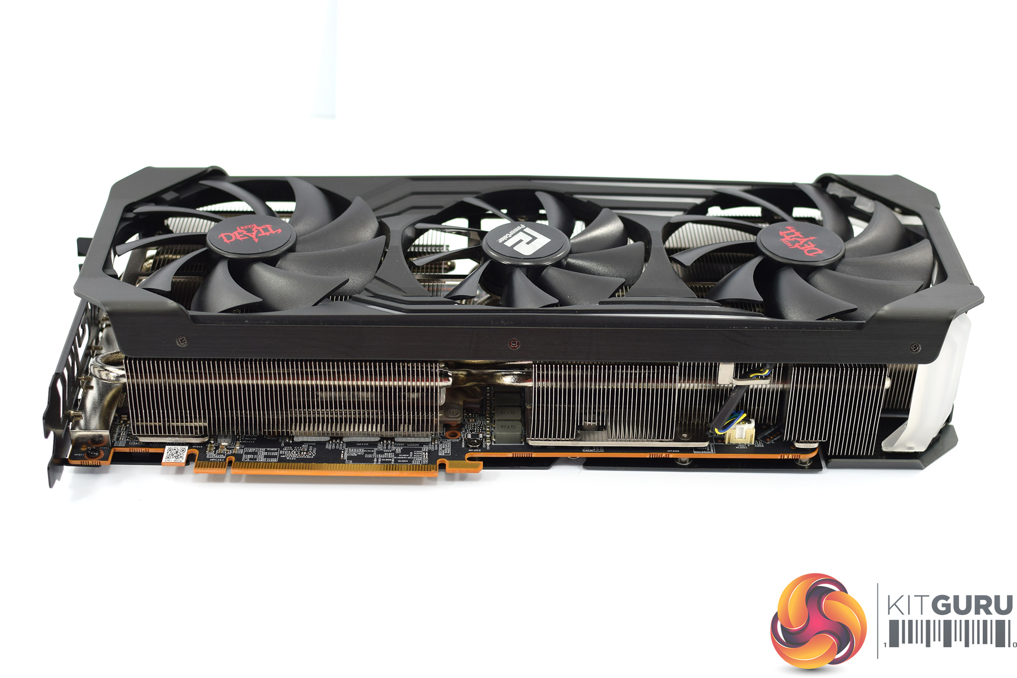 Compared to the RX 5700 XT Red Devil, the overall design is slightly less aggressive and ‘flatter', whereas the last-gen card had a more angular and ‘in-your-face' appearance. The only bits of colour are the red Red Devil stickers on the two outer fans.