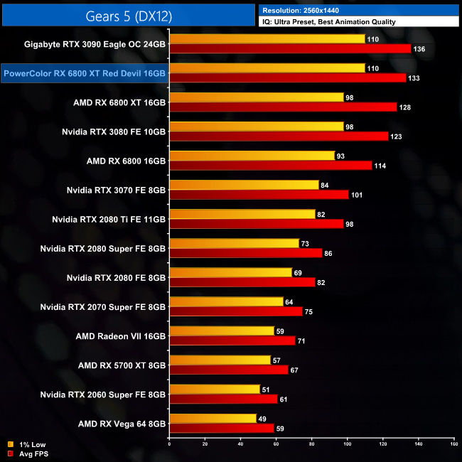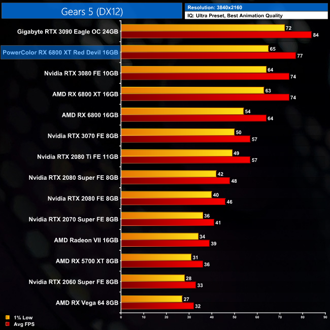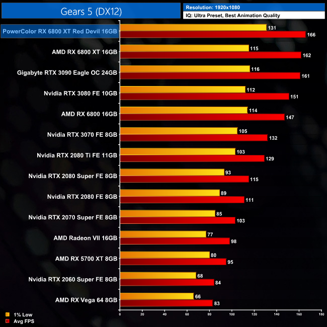 Next up is Gears 5, and here the Red Devil's factory overclock is enough to take it 4% ahead of both the reference RX 6800 XT and Nvidia's RTX 3080 Founders Edition, with the PowerColor card delivering an extra 3FPS.
