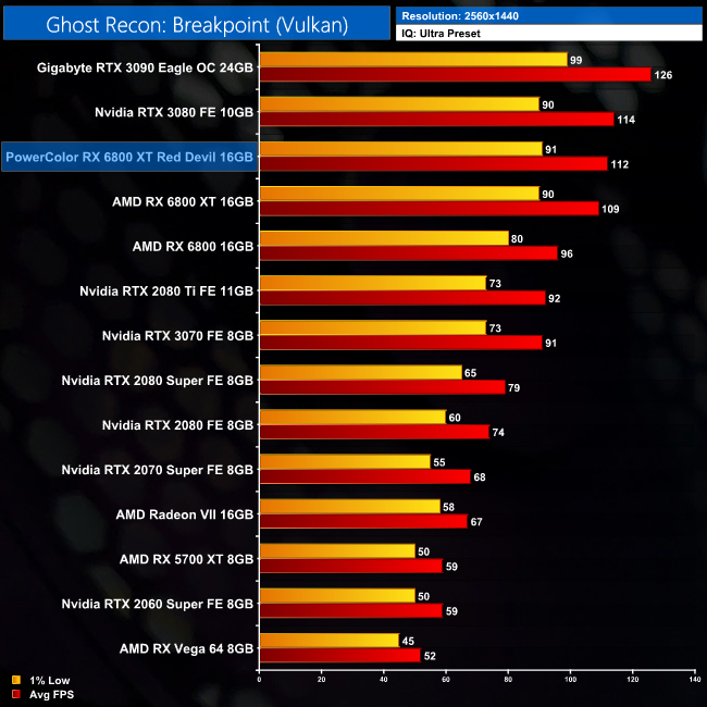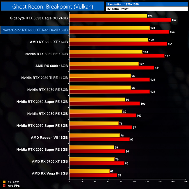 In Ghost Recon: Breakpoint, we see the smallest margin of increase for the Red Devil when compared to the reference card, across all of our games on test today. At 4K, the difference is just 3%, with the Red Devil averaging 61FPS.