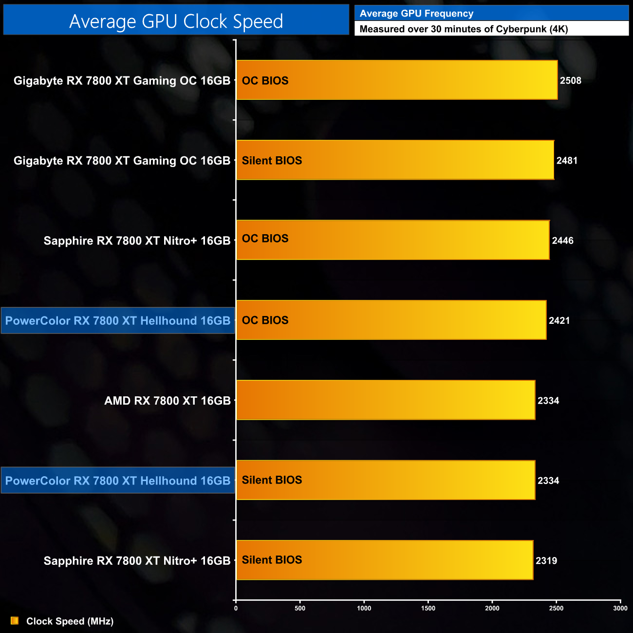 The small performance gains for the Hellhound come as a result of its factory overclock. PowerColor hasn't gone too crazy here, the company instead told us it was prioritising thermal and acoustic performance, but the OC BIOS averaged 2421MHz over our 30-minute stress test, making it 4% faster in terms of raw clock speed. The Silent BIOS does reduce clock speed to reference specifications, and I kid you not, the average clock speed proved identical over our testing between that and AMD's reference card.