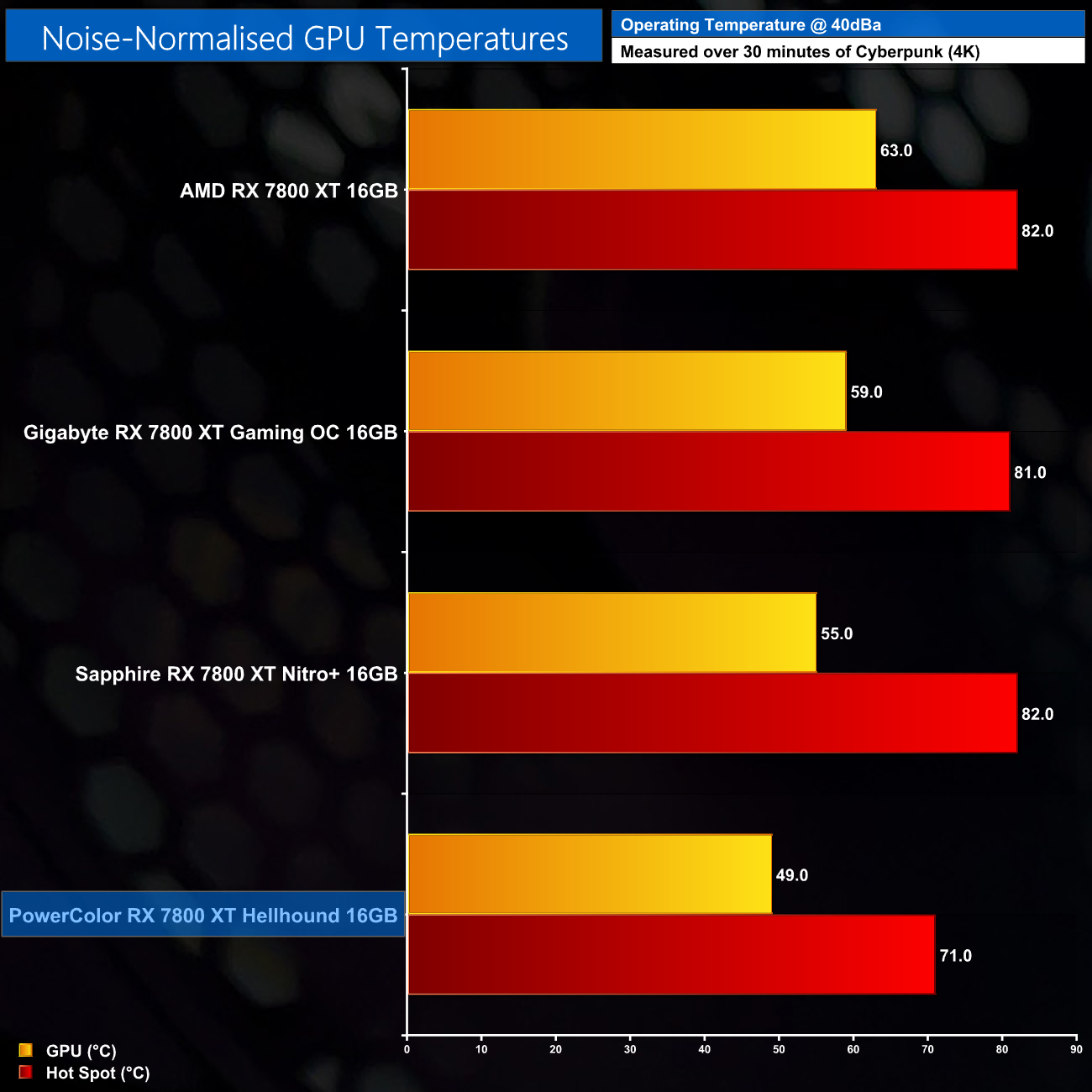 The Hellhound is most impressive when we look at noise-normalised thermals. Here we raised fan speed to 55%, or 1750rpm, to hit 40dBa and test thermal performance again. This time the GPU peaked at just 49C, with the hot spot at 71C, making this the most efficient 7800 XT cooler we have tested – it is impressive stuff from PowerColor.