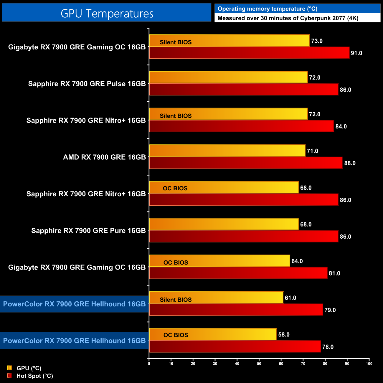 For our temperature testing, we measure the peak GPU core temperature under load. A reading under load comes from running Cyberpunk 2077 for 30 minutes.
