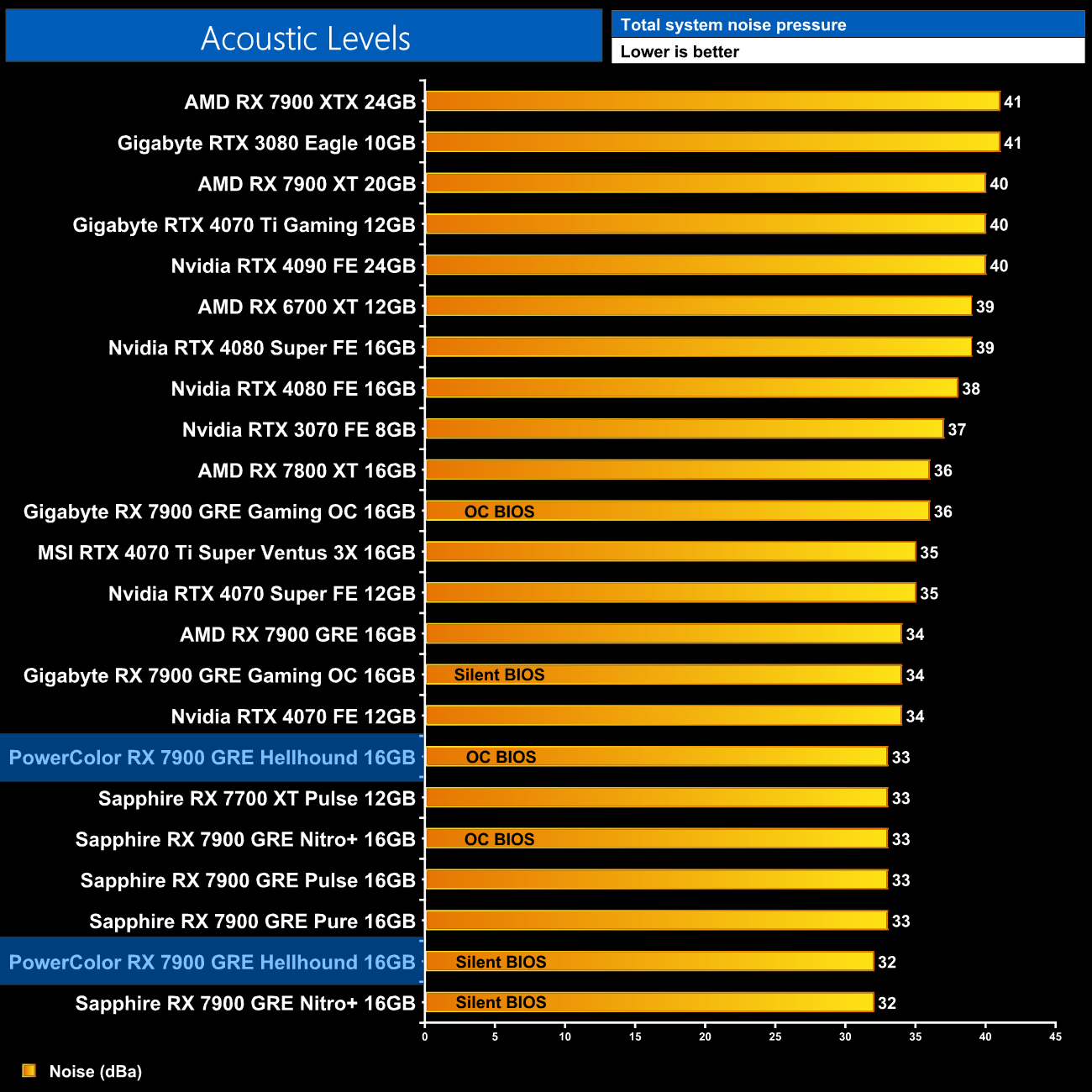 We take our noise measurements with the sound meter positioned 1 foot from the graphics card. I measured the noise floor to be 32 dBA, thus anything above this level can be attributed to the graphics cards. The power supply is passive for the entire power output range we tested all graphics cards in, while all CPU and system fans were disabled. A reading under load comes from running Cyberpunk 2077 for 30 minutes.