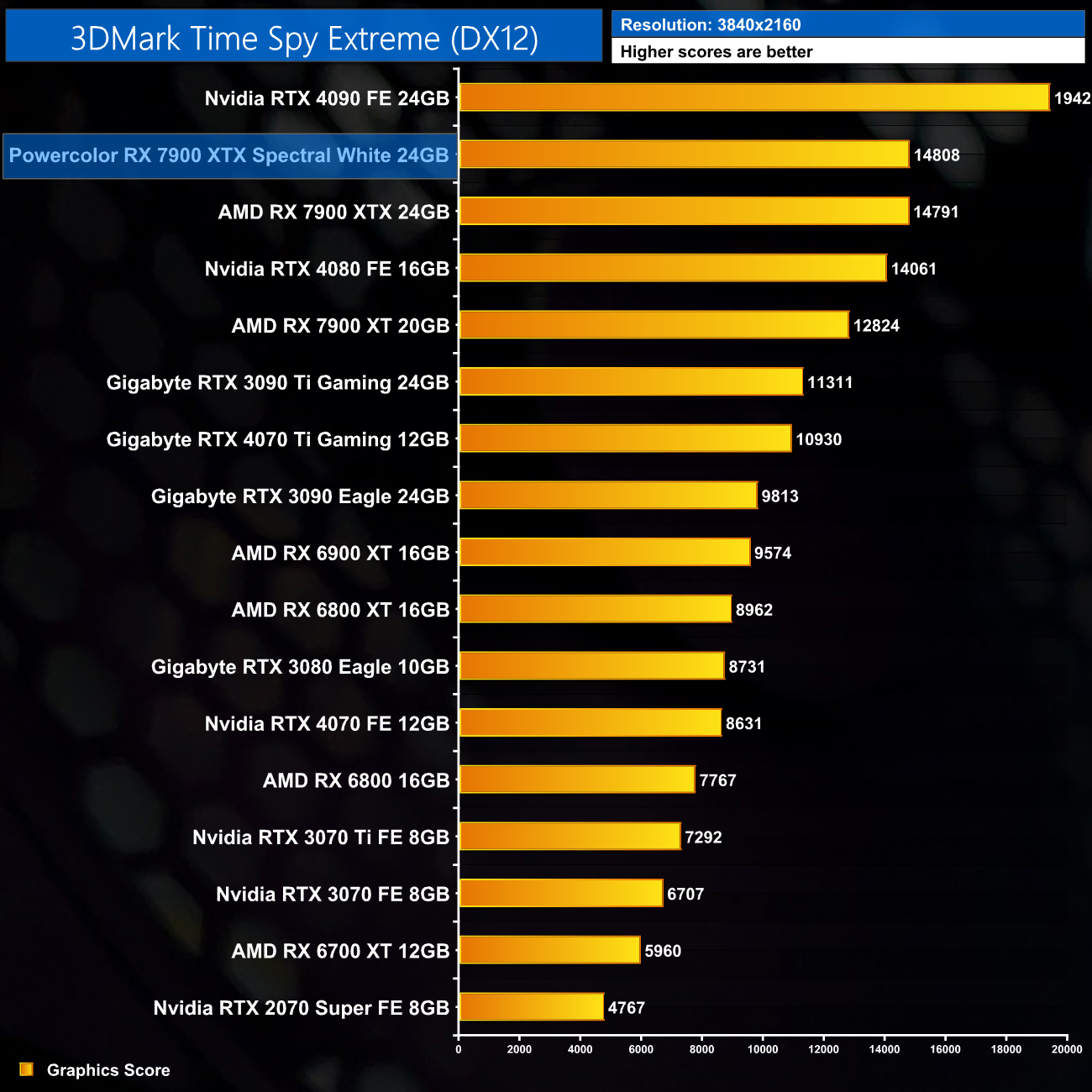 Getting our first look at performance, there is next to no difference between the Spectral White and the reference 7900 XTX – we're talking a margin of less than 20 points in 3DMark Time Spy Extreme.