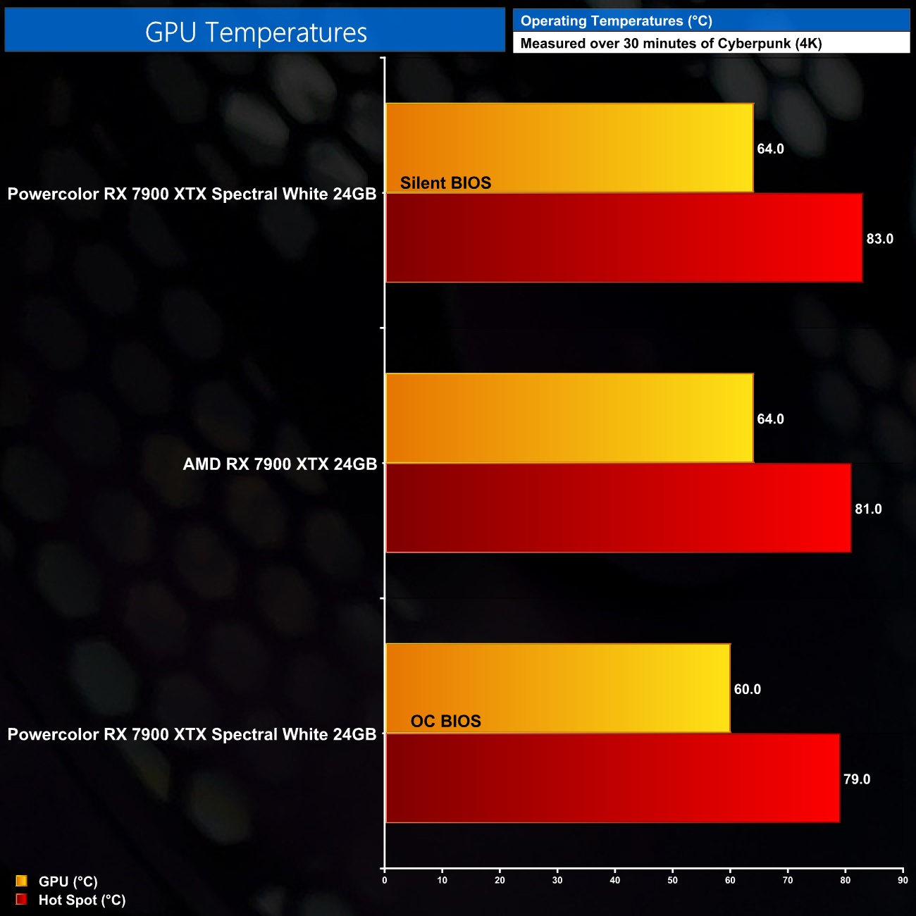 For our temperature testing, we measure the peak GPU core temperature under load. A reading under load comes from running Cyberpunk 2077 for 30 minutes.