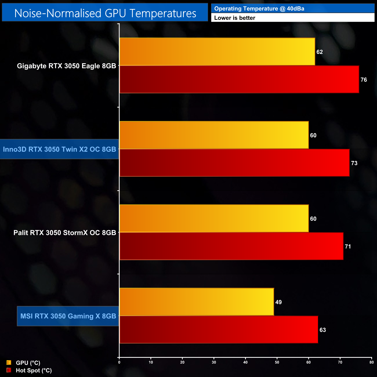 Interestingly, for the Twin X2 OC, we increased the fan speed to 64% (2070rpm) and that saw noise-normalised results basically matching the Palit StormX OC. You may be wondering how that is possible, but the StormX OC's cooler is actually the same one as used on the RTX 3060 model, so it's got a total of 3 heatpipes crammed in there – one more than even the Twin X2 OC.