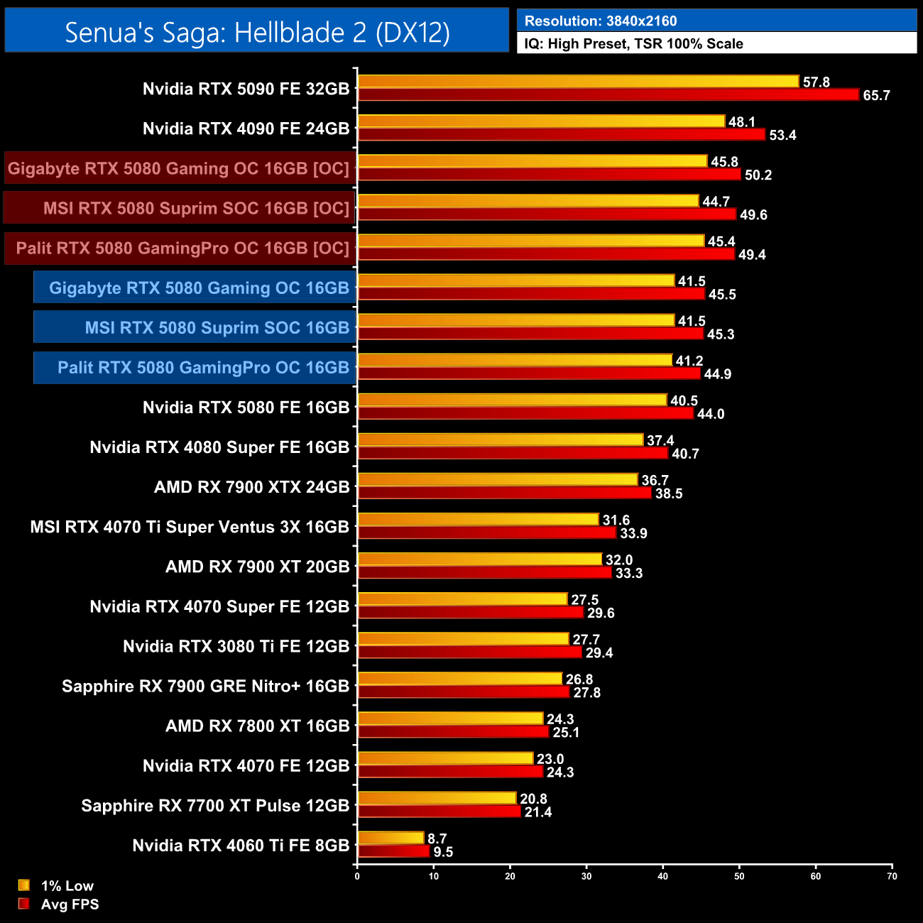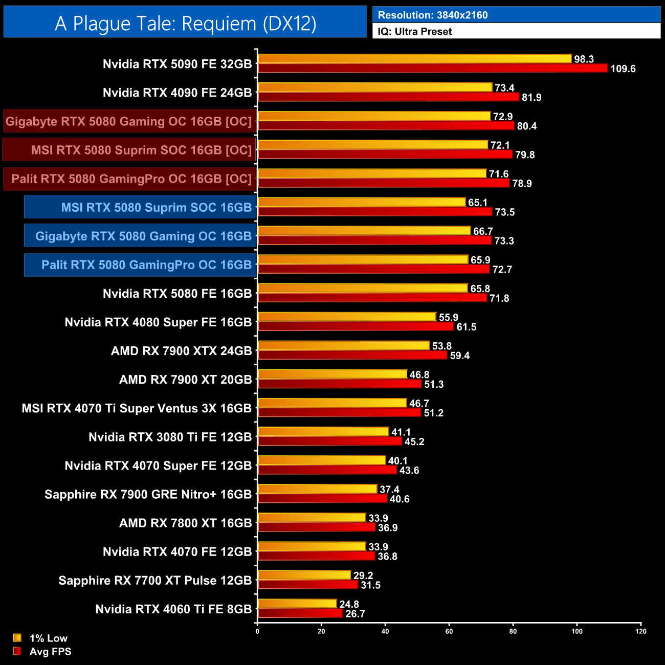 Now all three overclocks were pretty impressive, and all three models ran at over 3150MHz, resulting in gains of 7-10% over the stock results. There;s very little to split between the three in terms of which one overclocked the best, the Gaming OC was a frame ahead on a couple of occasions, but nothing at all significant.