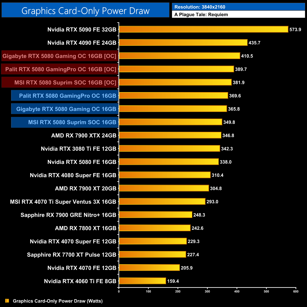The Gaming OC did see the biggest increase to power draw though, hitting 410.5W, a 20W increase over the GamingPro OC on 389.7W, while the Suprim SOC was the most frugal at just under 382W.