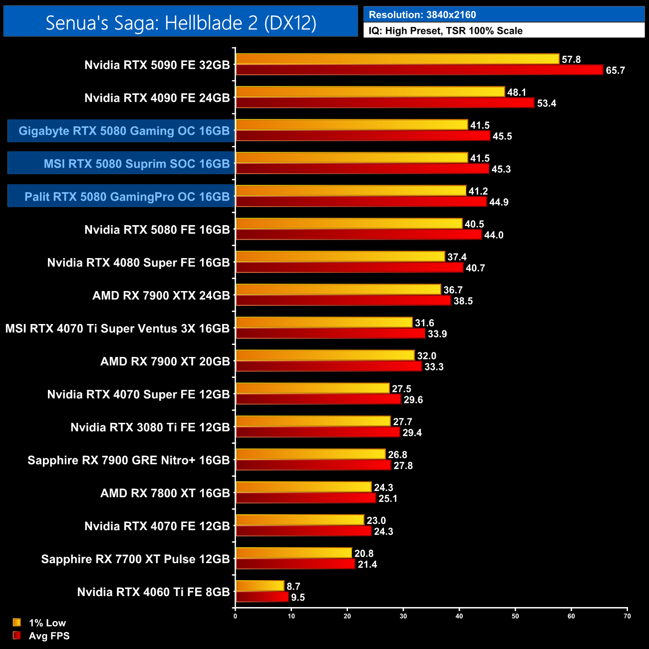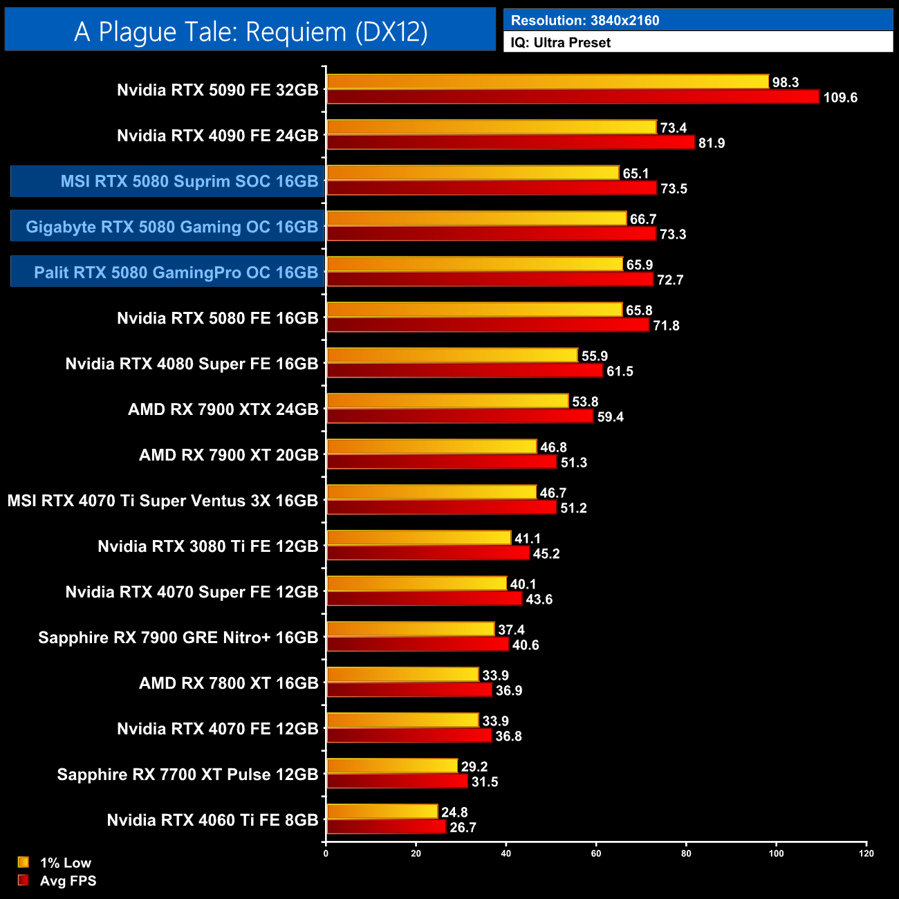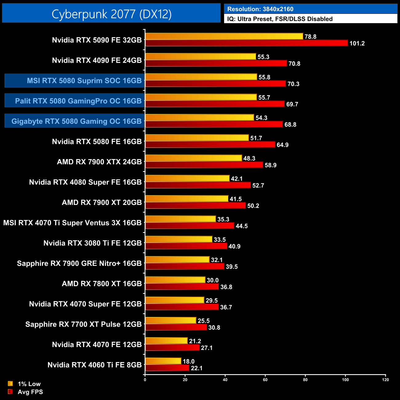 We don't focus too heavily on game benchmarks in our partner cards reviews as performance doesn't tend to change a whole lot when compared to the reference models. In this instance, all three RTX 5080s we are reviewing today perform functionally identically, given there's typically less than a single frame separating all three – there's no way you'd actually spot the difference between the cards when gaming in the real world.