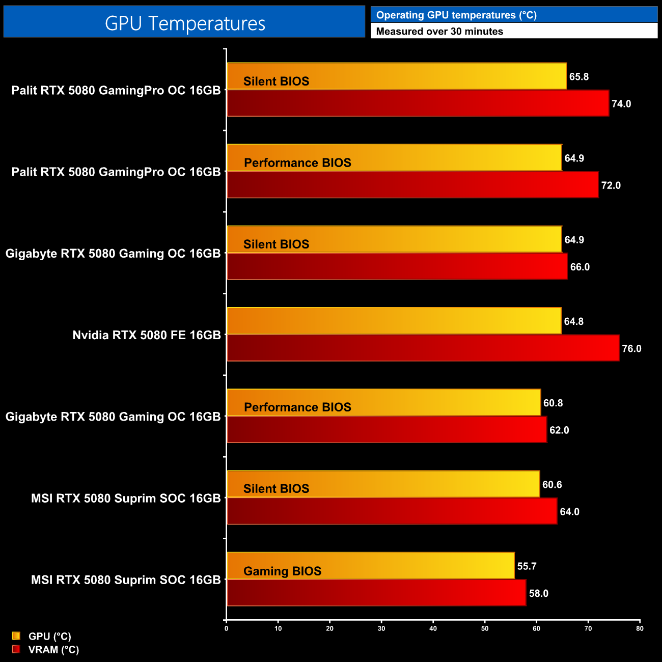 As for thermal performance, here I've tested both BIOS modes for all three cards, and honestly, the results are as expected. The MSI Suprim SOC does offer the lowest raw thermals, but I was hoping to see that given it's using the same cooler from the RTX 5090 Suprim SOC. The Gaming OC Performance BIOS is in third place, while its Silent BIOS – and both modes of the Gaming Pro OC – all hover around the 65C mark.