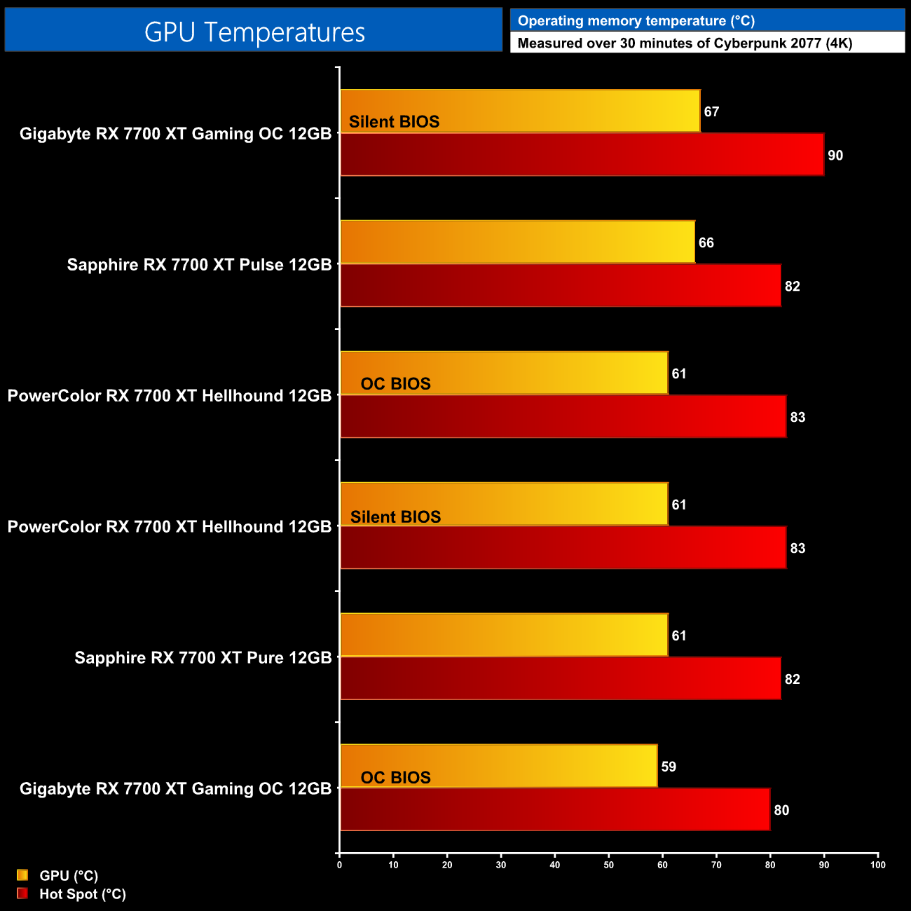 For our temperature testing, we measure the peak GPU core temperature under load. A reading under load comes from running Cyberpunk 2077 for 30 minutes.
