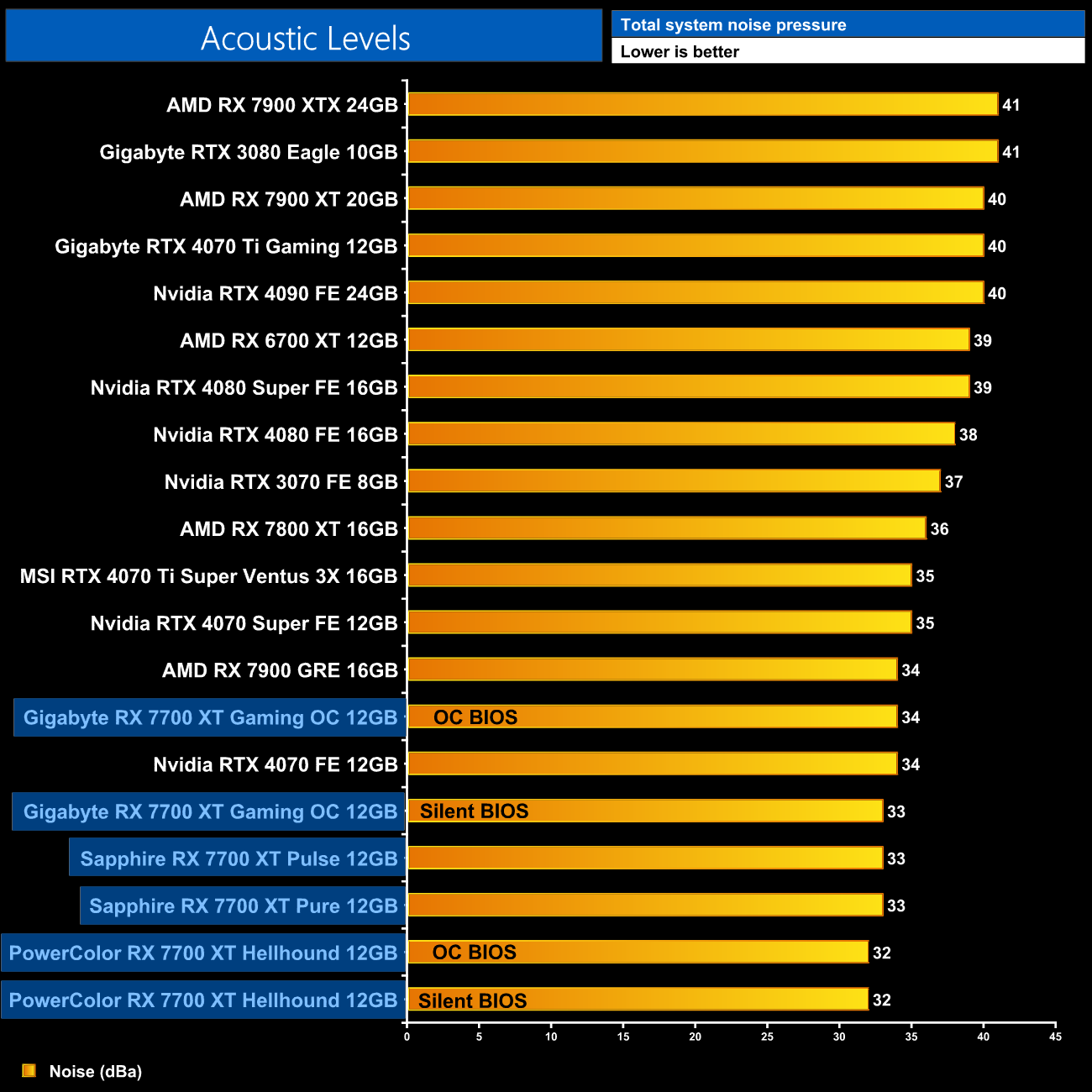 We take our noise measurements with the sound meter positioned 1 foot from the graphics card. I measured the noise floor to be 32dBA, thus anything above this level can be attributed to the graphics cards. The power supply is passive for the entire power output range we tested all graphics cards in, while all CPU and system fans were disabled. A reading under load comes from running Cyberpunk 2077 for 30 minutes.
