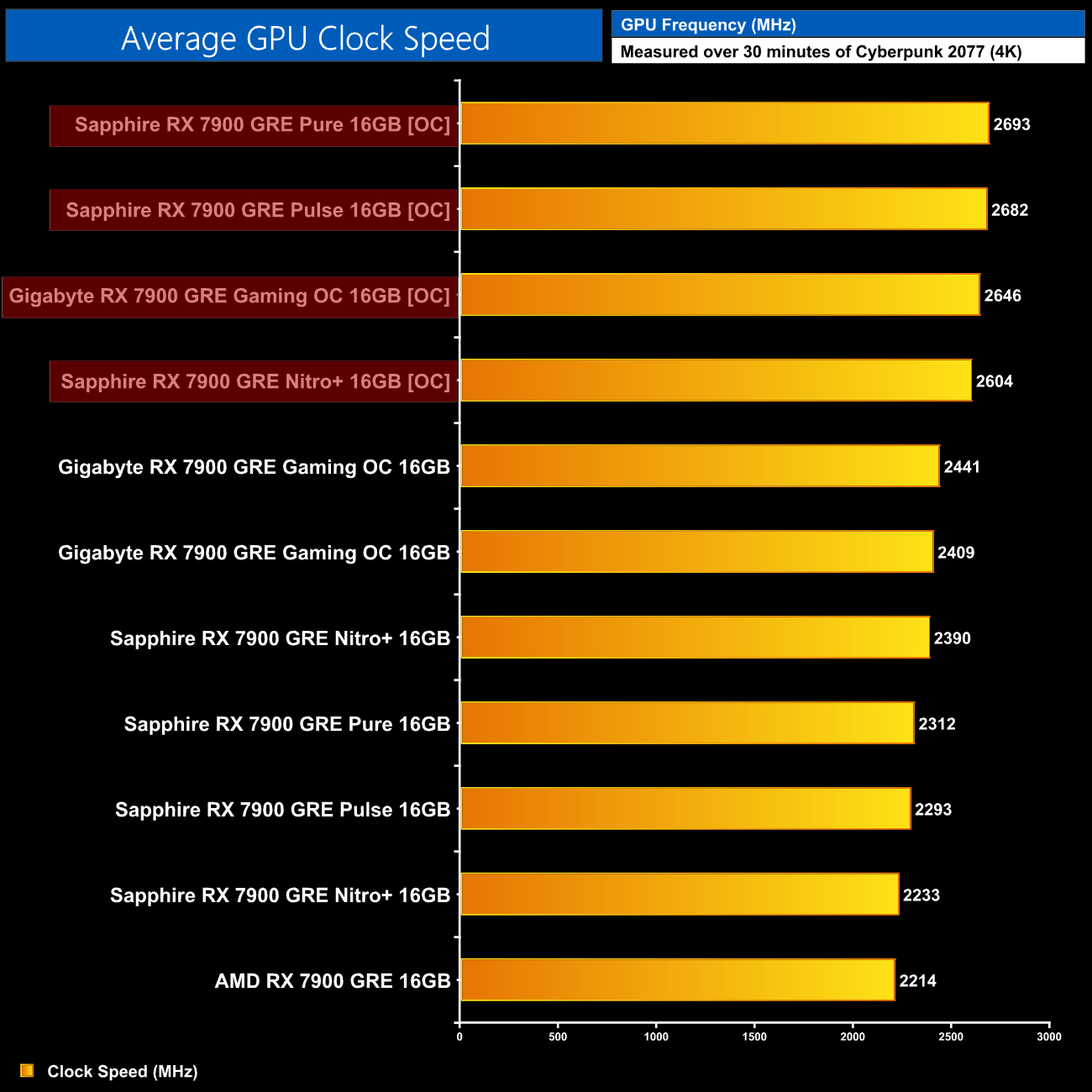 With these overclocks dialled in, all four cards managed to run at over 2600MHz, with the Pure and Pulse actually getting closer to 2700MHz in my testing.
