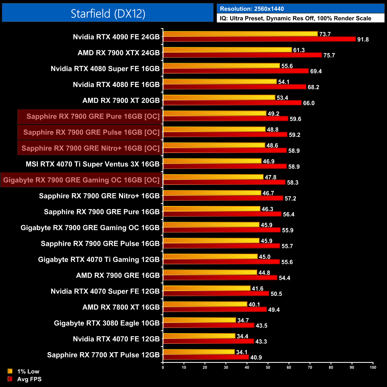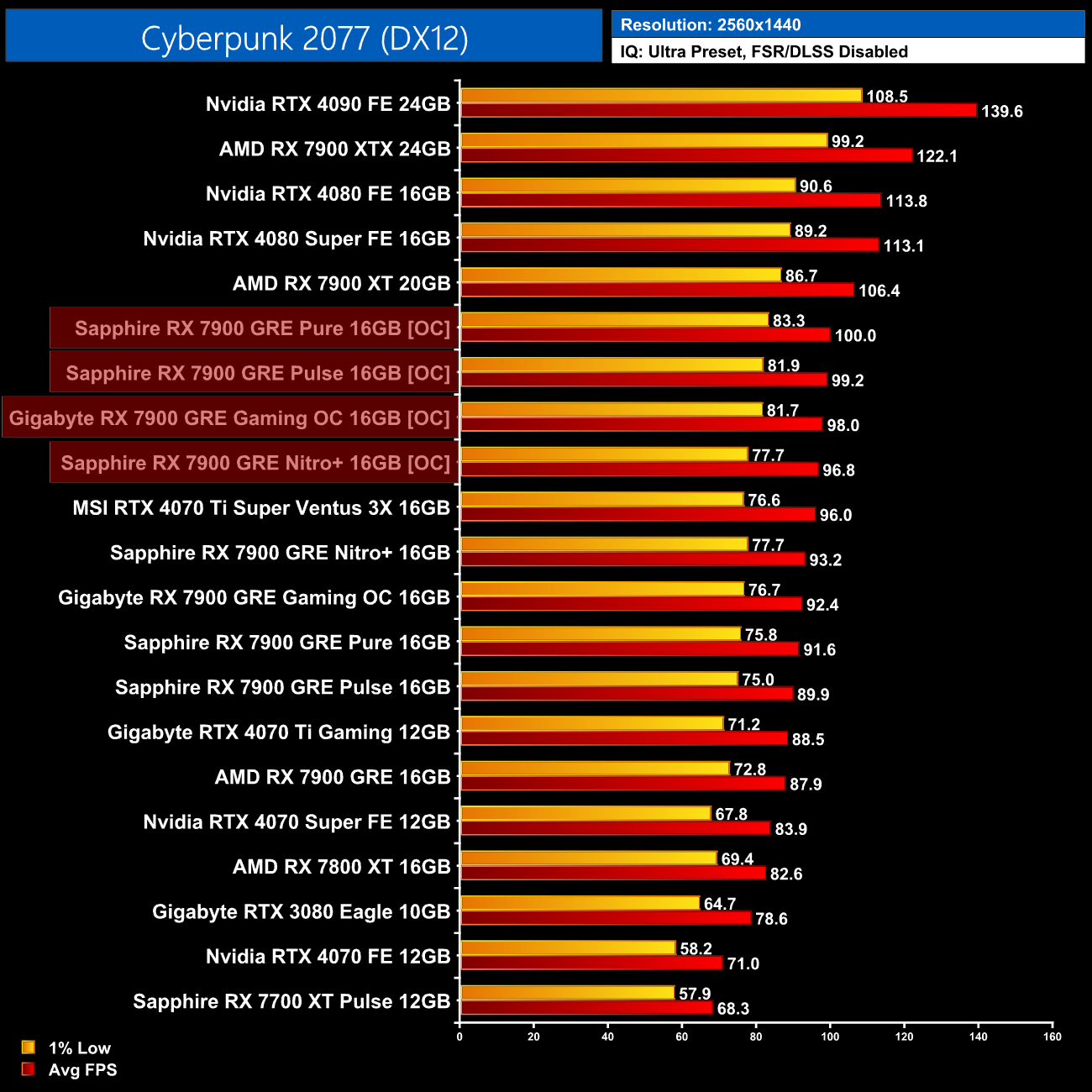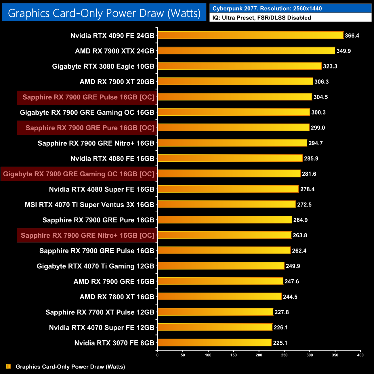 Interestingly, power draw for the Nitro+ and Gaming OC actually dropped when overclocked, despite the fact I increased the power limit up to its maximum of 115%. I'm not sure if this is a bug or strange architectural quirk, but it's not what I expected to see and isn't something I've come across with other RDNA 3 cards.