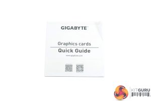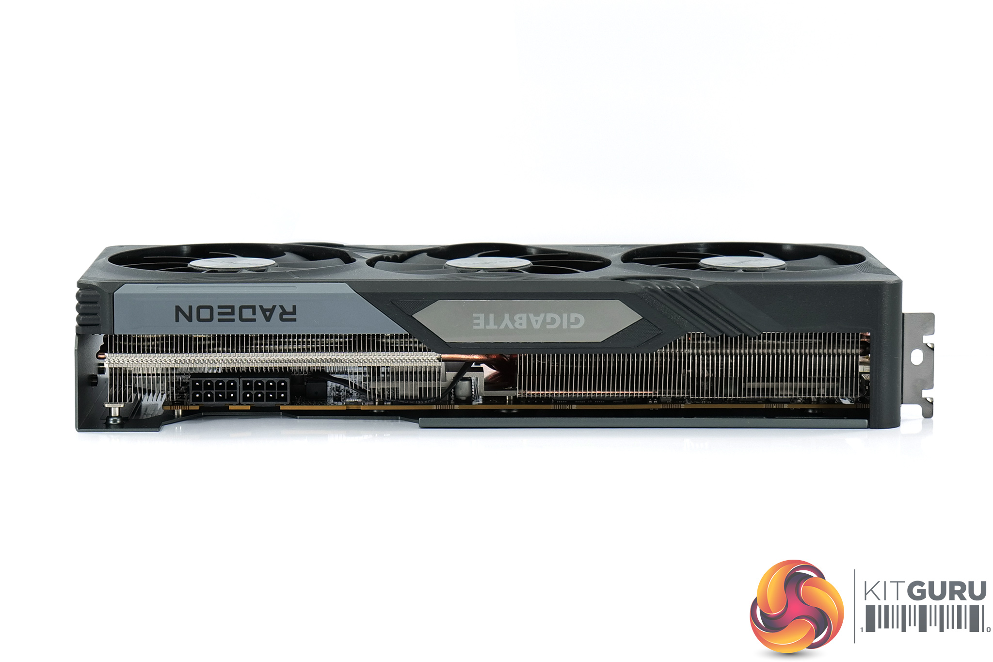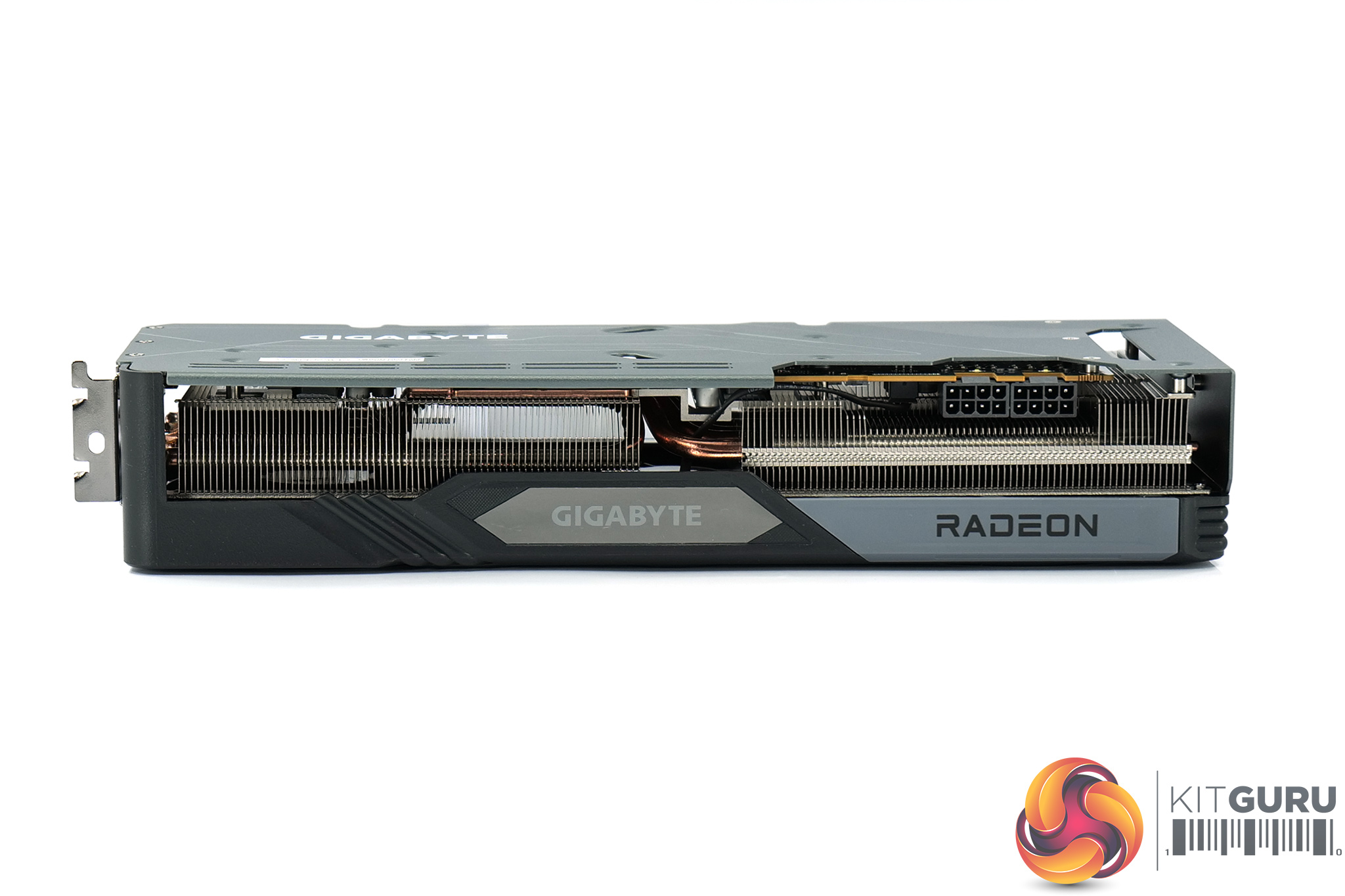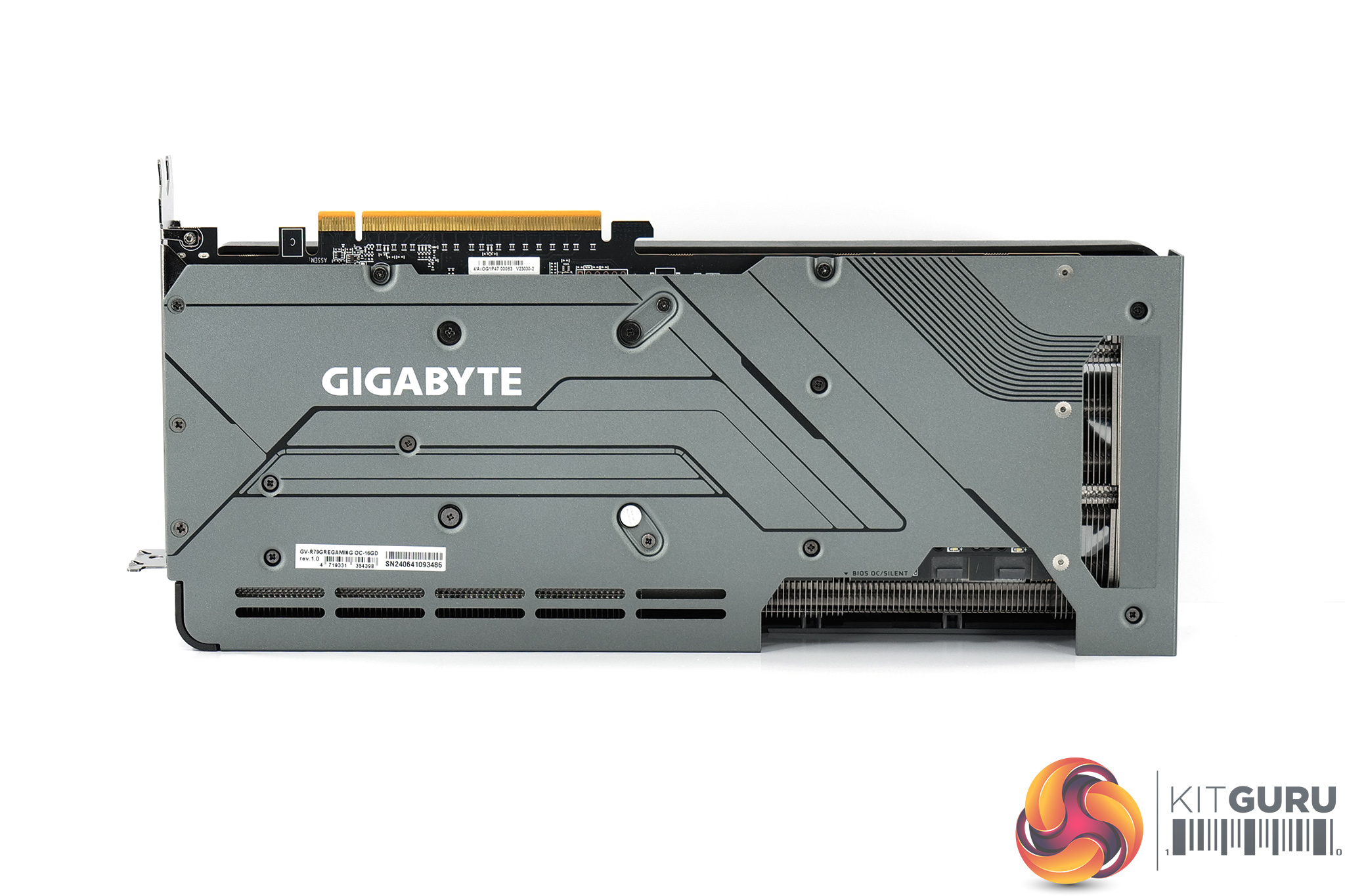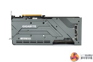 Flipping over to the backplate, this is a full-length design that is made of a grey metal. We can see the Gigabyte logo printed in white, while there is a very small cut-out right at the end of the card to allow some air to pass straight out of the heatsink – but as this is so small, I'm not sure it will do a whole lot for cooling.