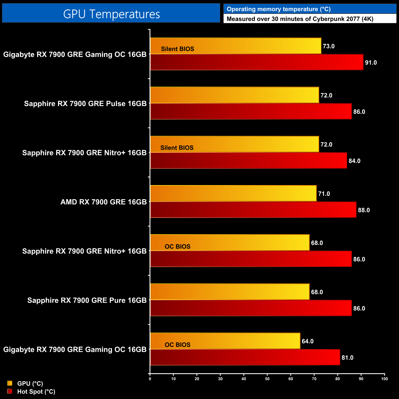 For our temperature testing, we measure the peak GPU core temperature under load. A reading under load comes from running Cyberpunk 2077 for 30 minutes.