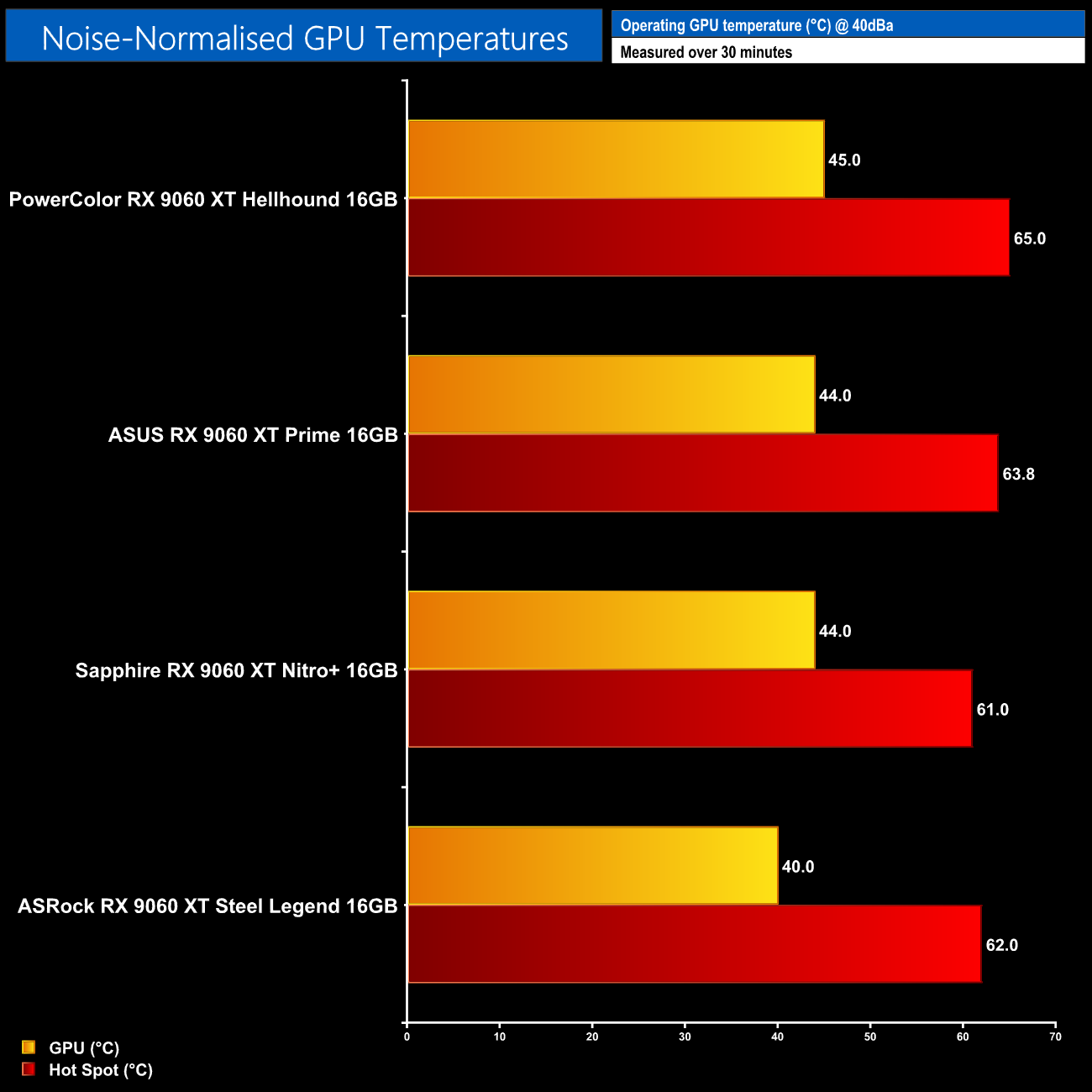 Things are still very close overall when looking at our noise-normalised thermal results. The Steel Legend does claim a narrow victory here, but with just 5C separating top from bottom when looking at the GPU temperature, I'm not convinced that would make a meaningful difference over the lifespan of these cards. In short, all four models tests offer very capable coolers for dealing with the Navi 44 silicon.