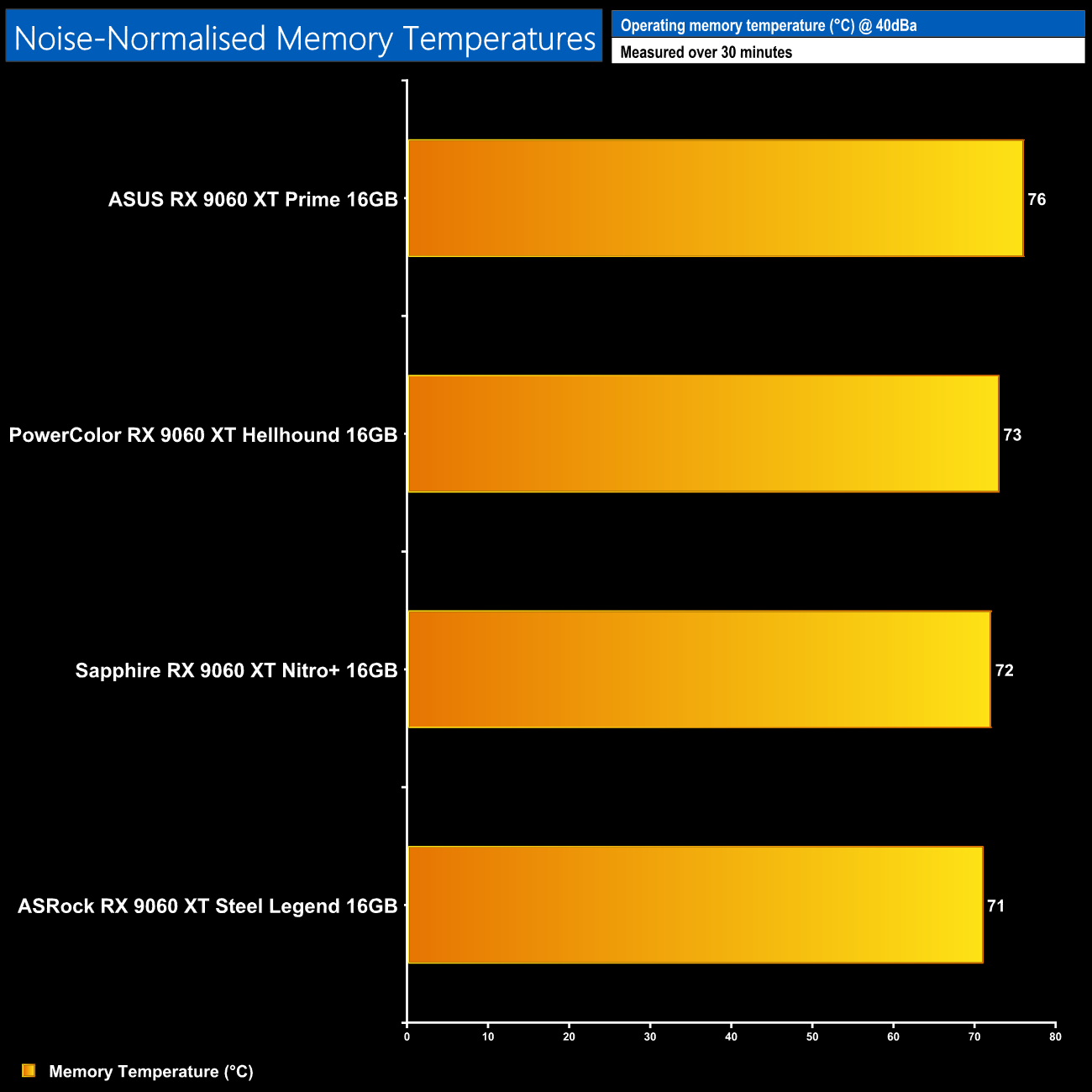 Likewise, memory thermals are again very close overall when noise-normalised – once more, just 5C separates top from bottom, though it is th Steel Legend that takes victory by the slenderest of margins.