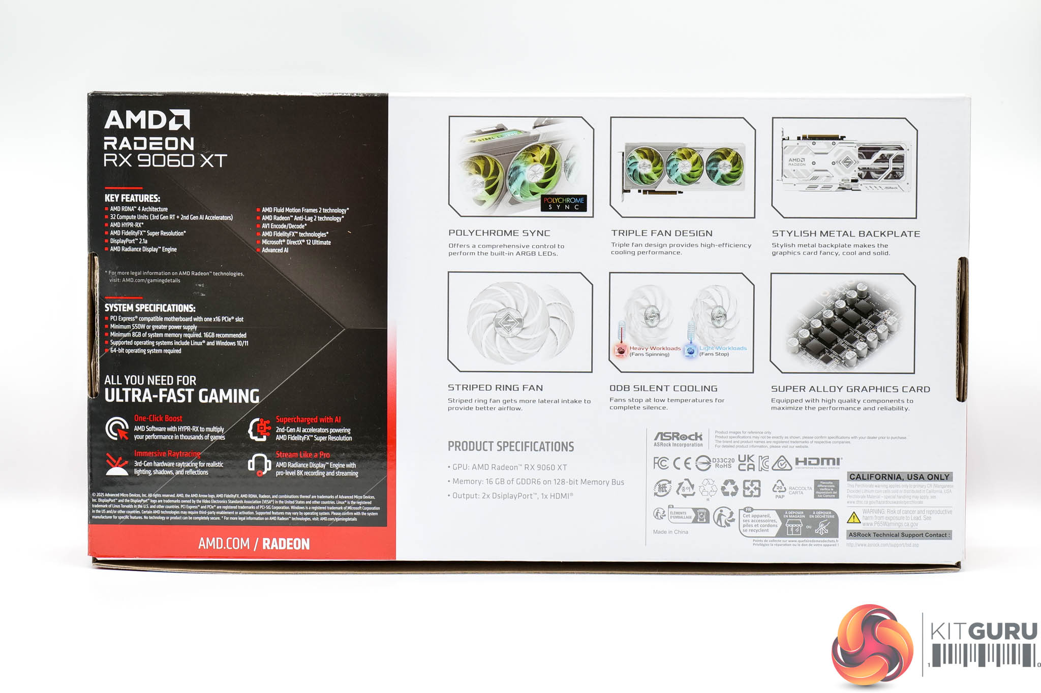 Starting off with the ASRock RX 9060 XT Steel Legend 16GB, this ships in a white and black box, with a few features of the card and cooler design highlighted on the back.