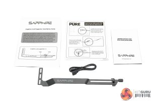 Inside, Sapphire includes some assorted documentation, along with an ARGB cable and a GPU support bracket.