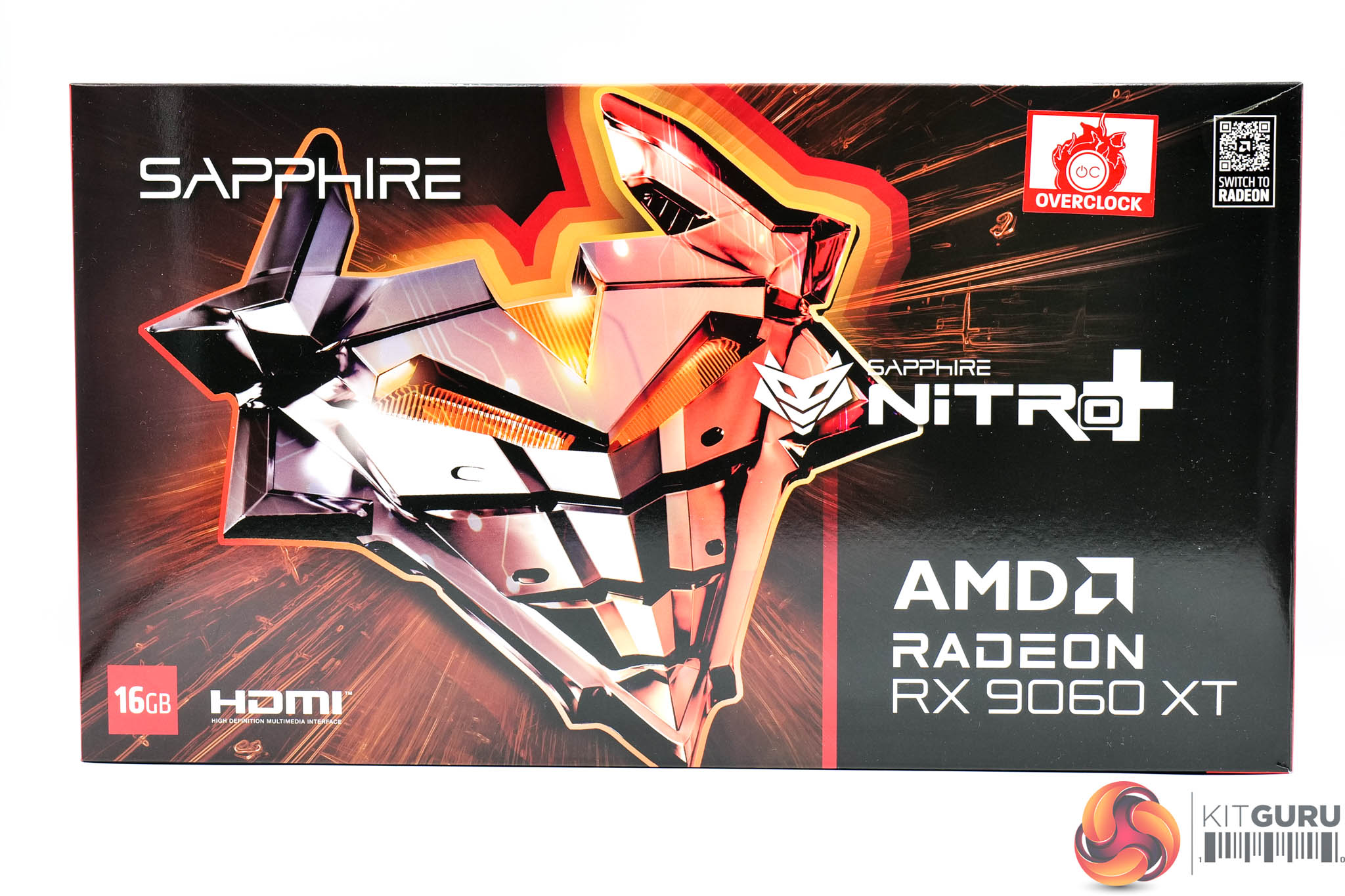 Then we come to the Sapphire RX 9060 XT 16GB Nitro+, shipping in a fiery-looking box.